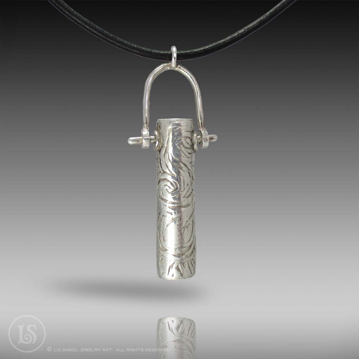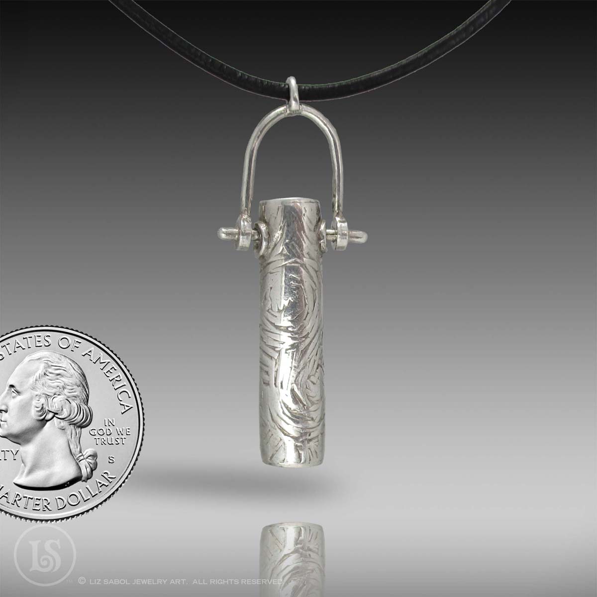 This texture was hand-carved into wax, then an impression was made in the clay, and formed into a hollow, swinging pendant. This pendant is hand-crafted in 999 fine silver metal clay.