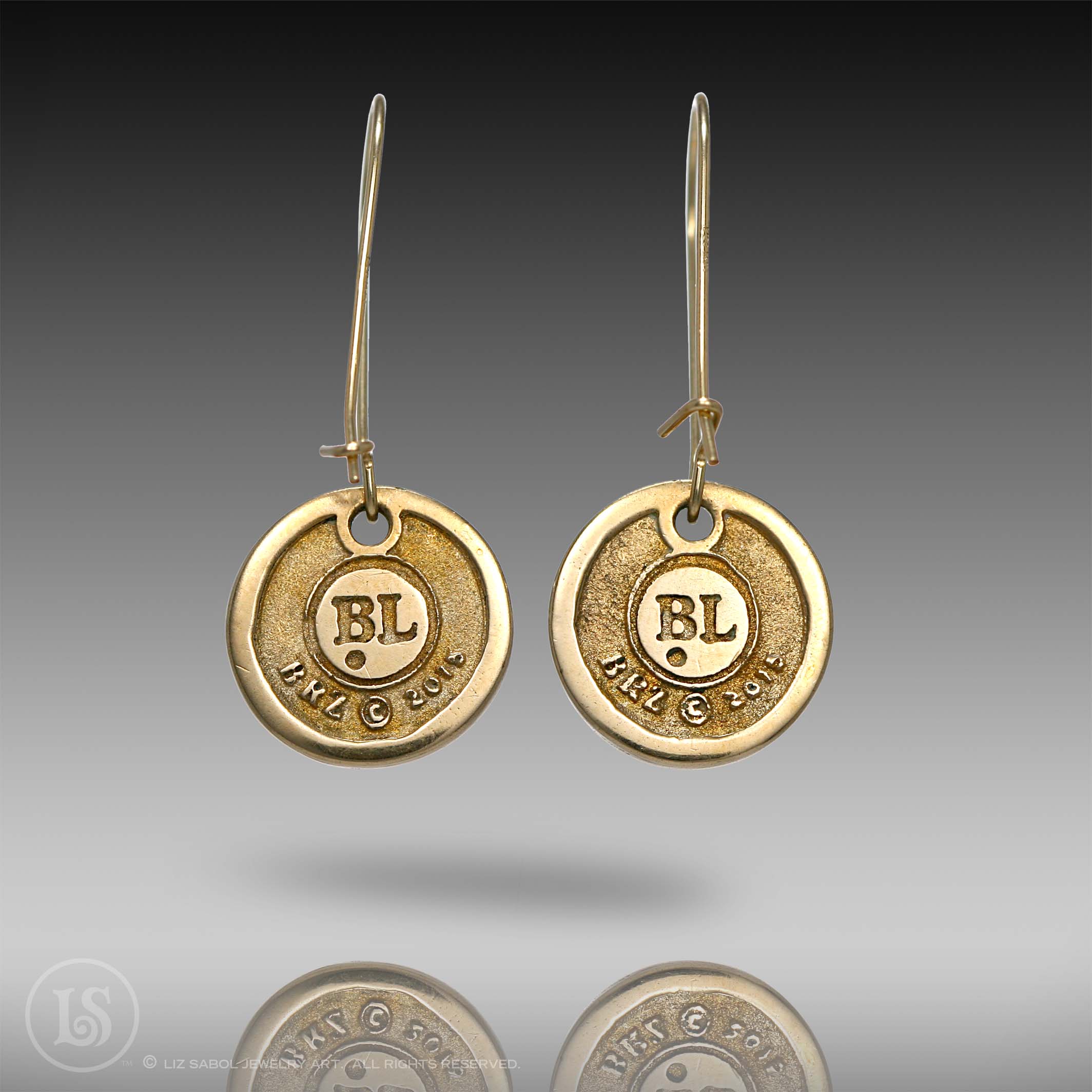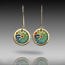 These earrings are hand-crafted in bronze metal clay, hand-painted and filled with resin. The resin is sanded flush and re-polished.