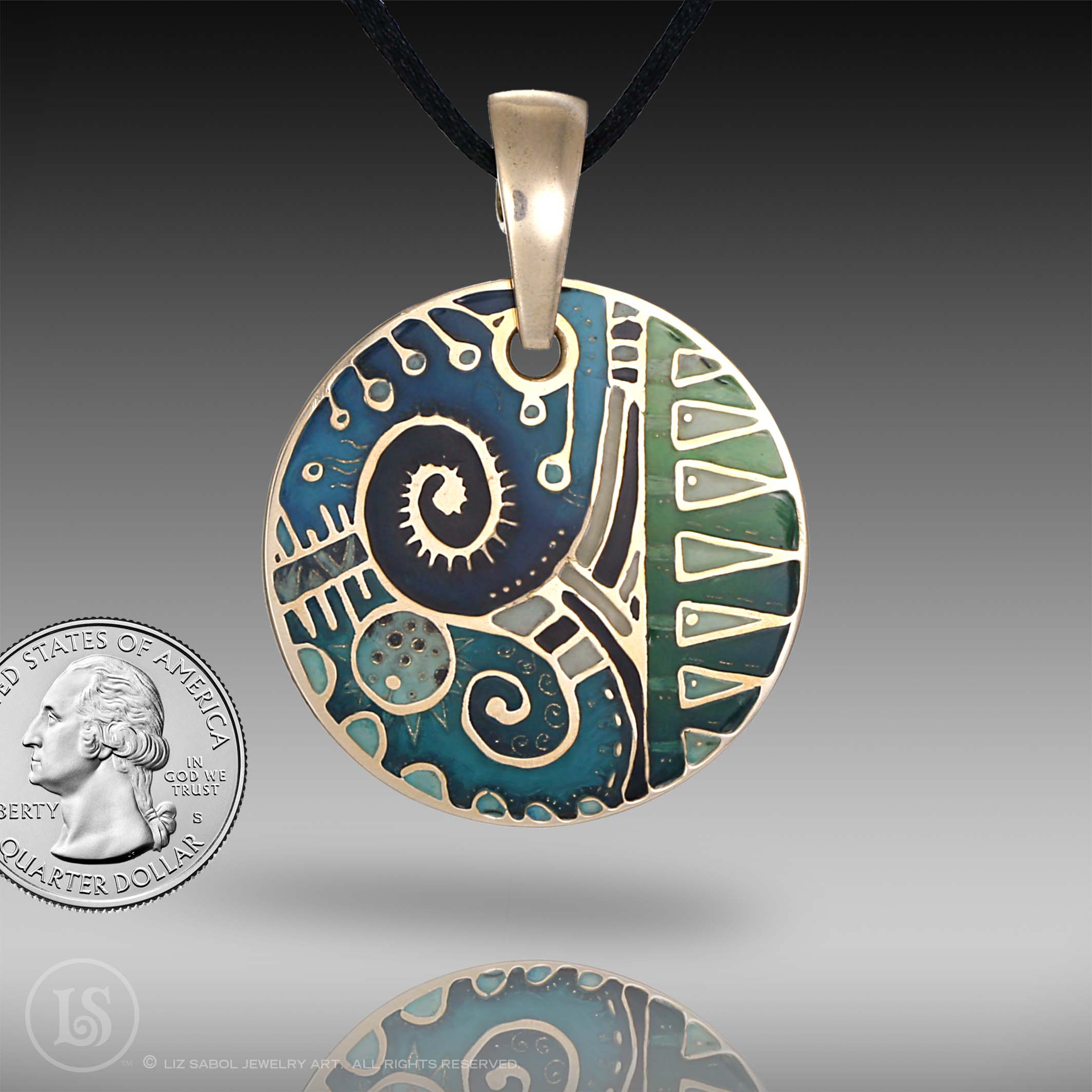This bronze pendant is hand-crafted in bronze metal clay, hand-painted and filled with resin.  The resin is sanded flush and re-polished.