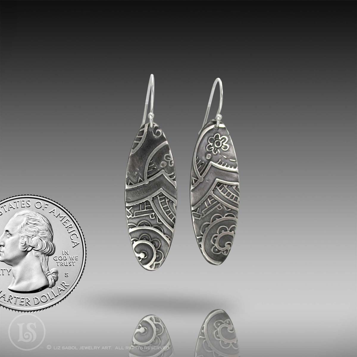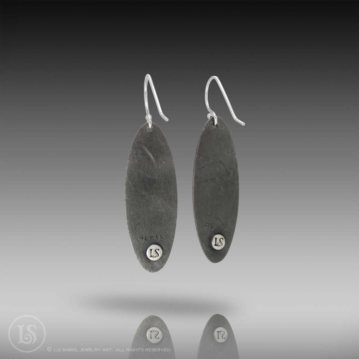These light-weight earrings feature a raised design, highlighted by a liver-of-sulfur patina. The design is derived from my "Paisley Moon" Champleve pendant,