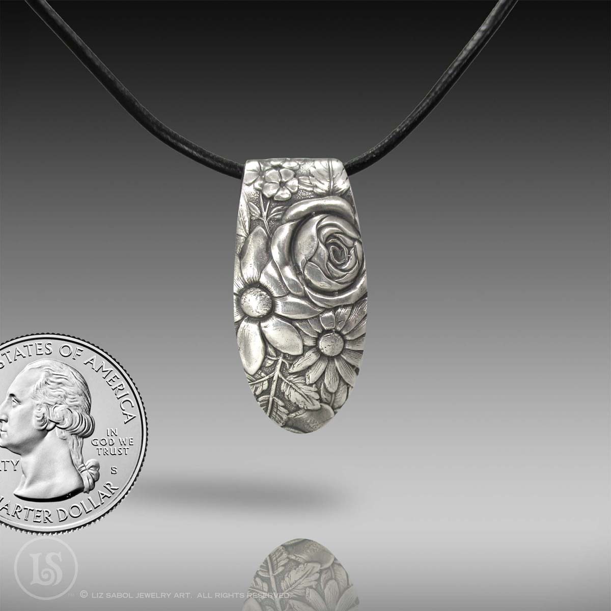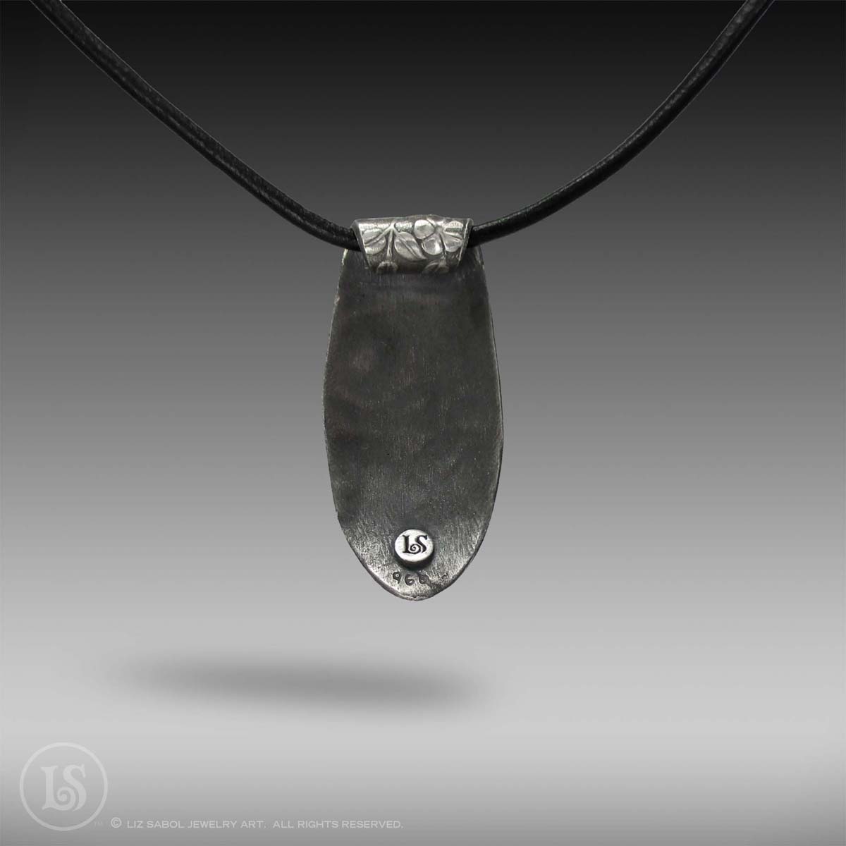 The beautiful dimensional texture for this pendant was made from an antique snifter bottle. This pendant is hand-crafted in 999 fine silver metal clay, and has a liver-of-sulfur patina.