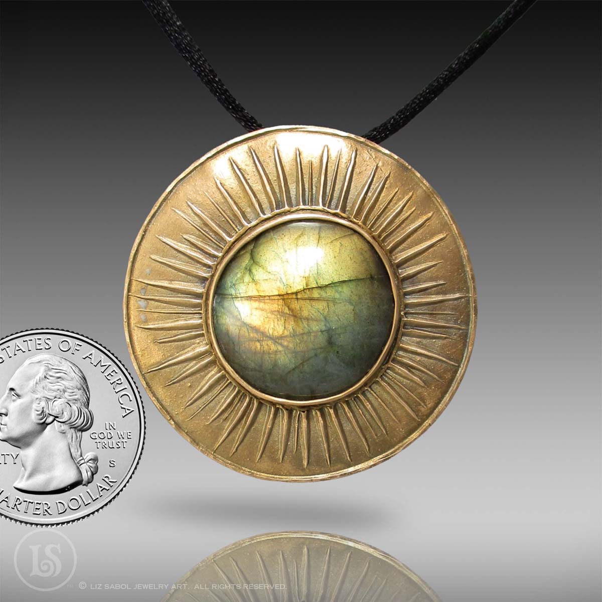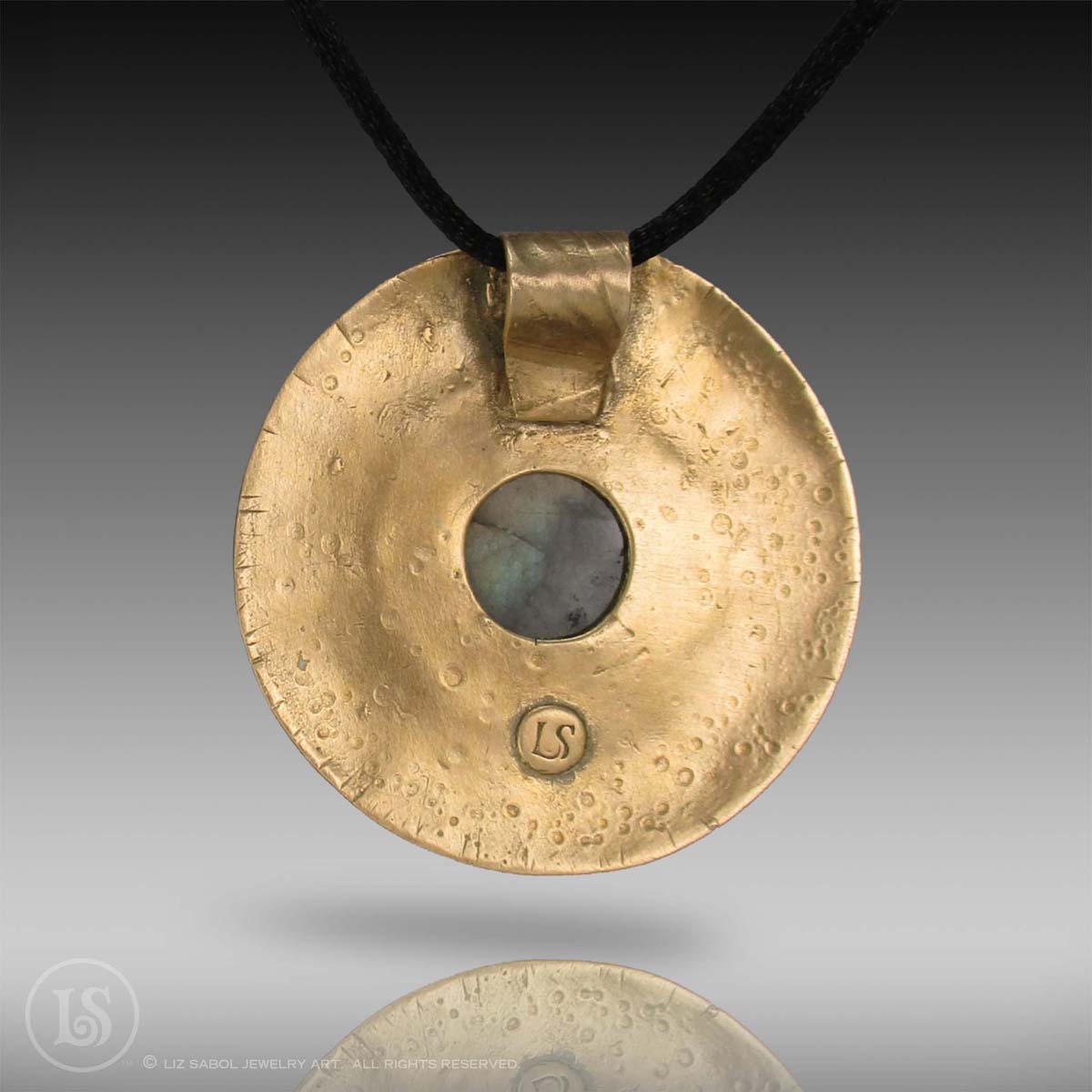 A piece of strength and power - harkens to ancient civilizations and sun worship.  This one-of-a-kind pendant is crafted in bronze metal clay and labradorite (n).