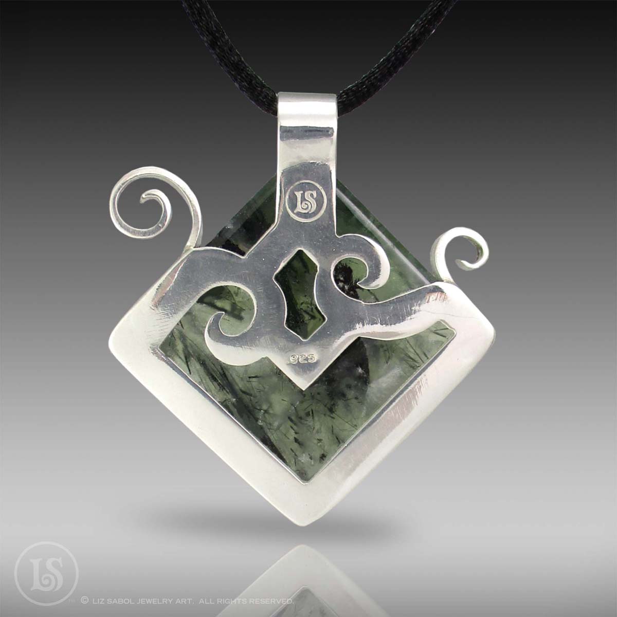 This pendant was inspired by the large central square prehnite stone, and has a unique pierced back. This one-of-a-kind pendant is crafted in sterling silver and gemstones - prehnite (n) and Chinese Chrysoprase (n).