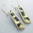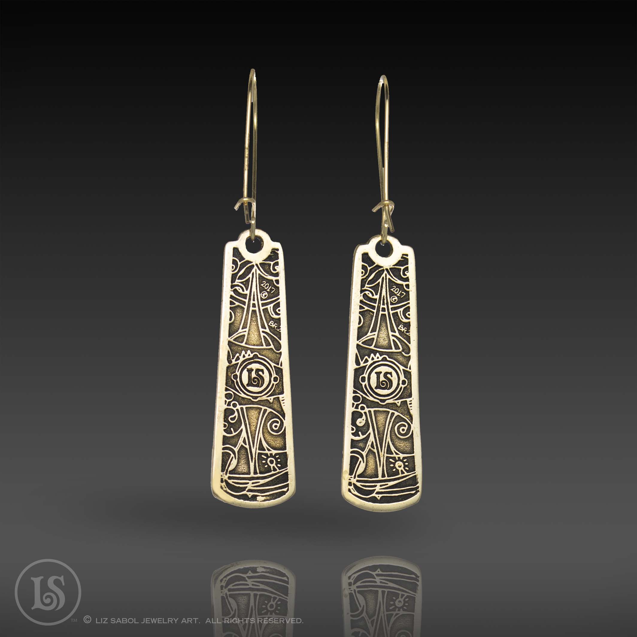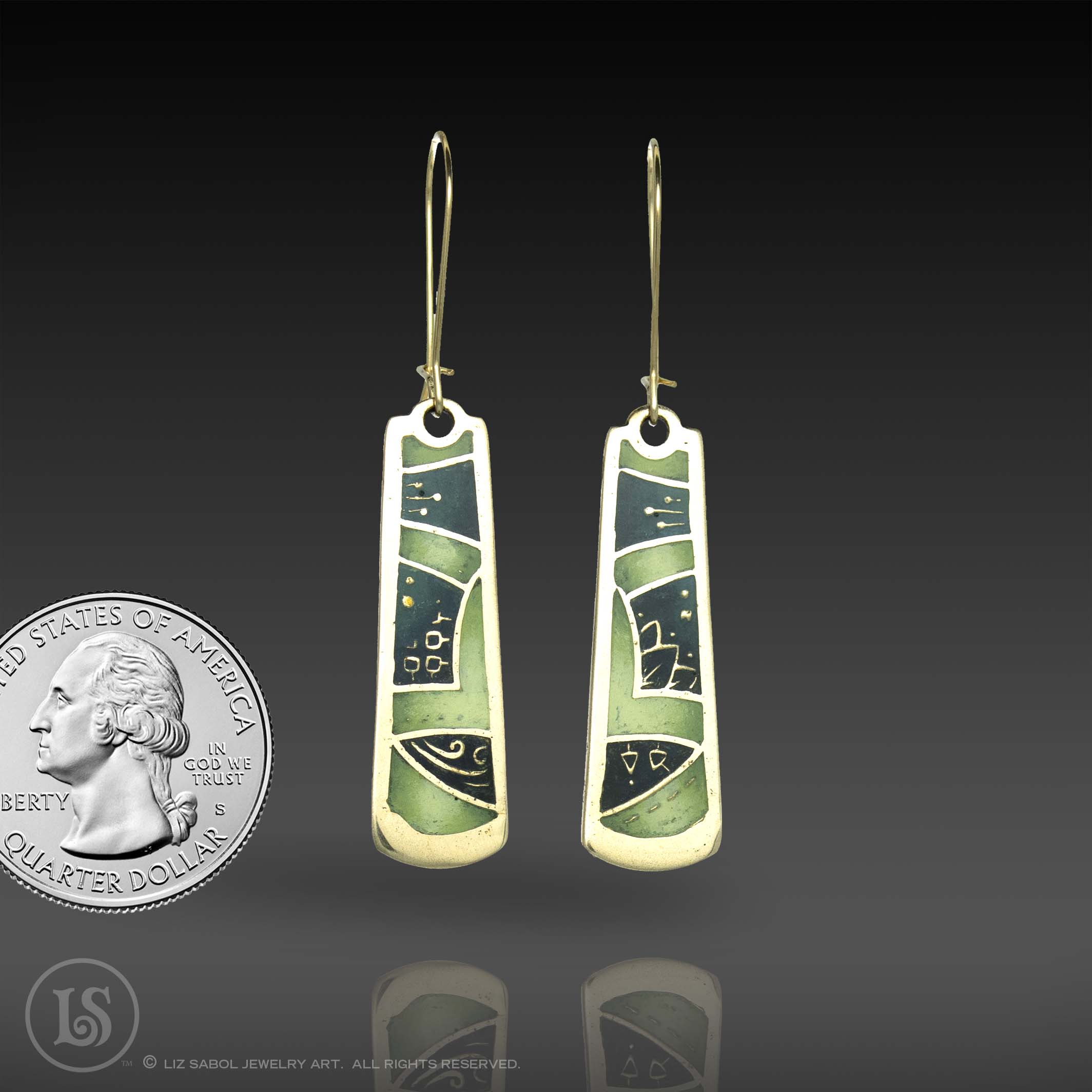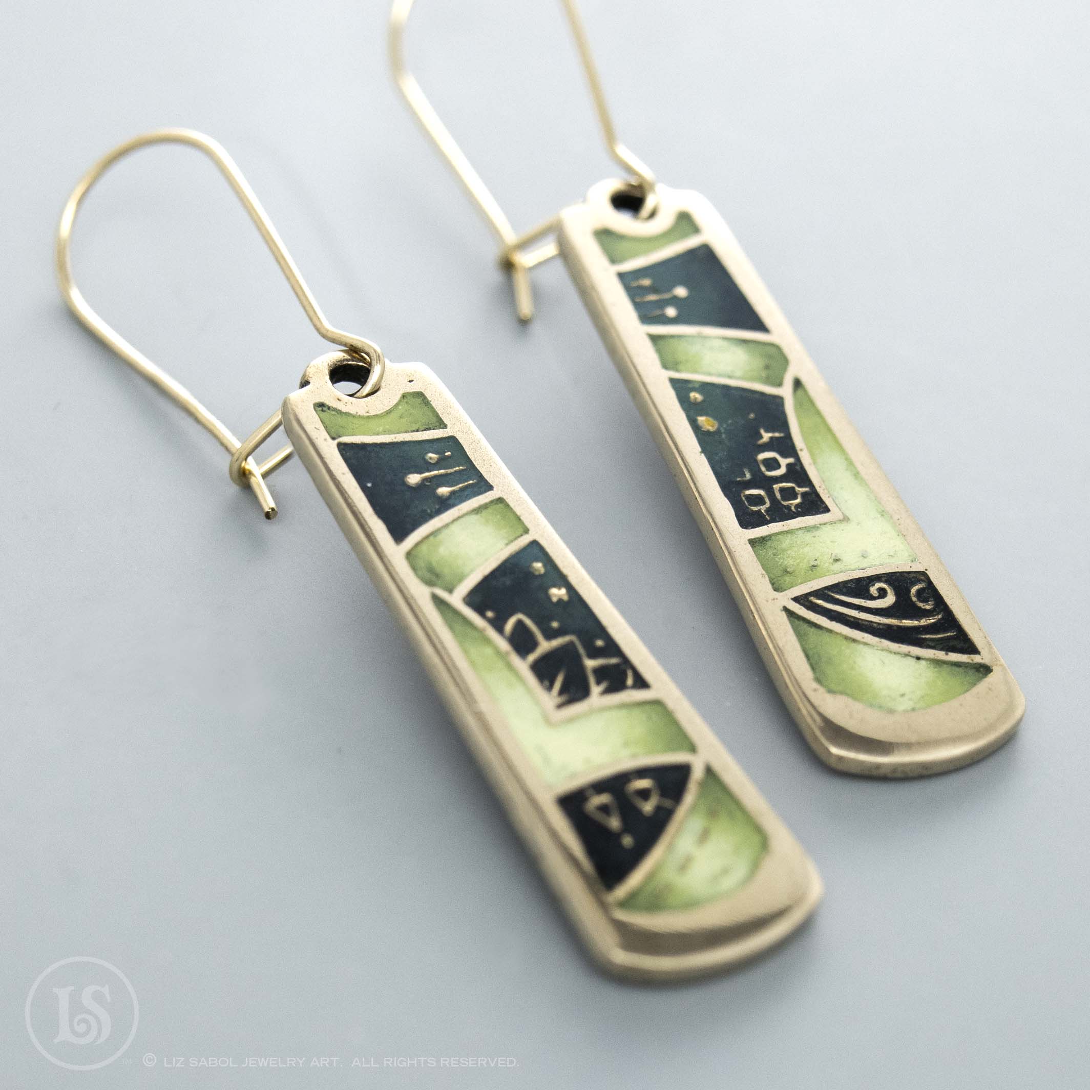 These earrings are hand-crafted in bronze metal clay, hand-painted and filled with resin.  The resin is sanded flush and re-polished.   The design is based on my Dreamweaver 2018 Saul Bell Design Award winning collection. The kidney earwires are 14K gold filled, and the wire thickness is 21 gauge.  There is a hook in the back, providing a secure closure to prevent loss. They are lightweight for comfortable wearing.