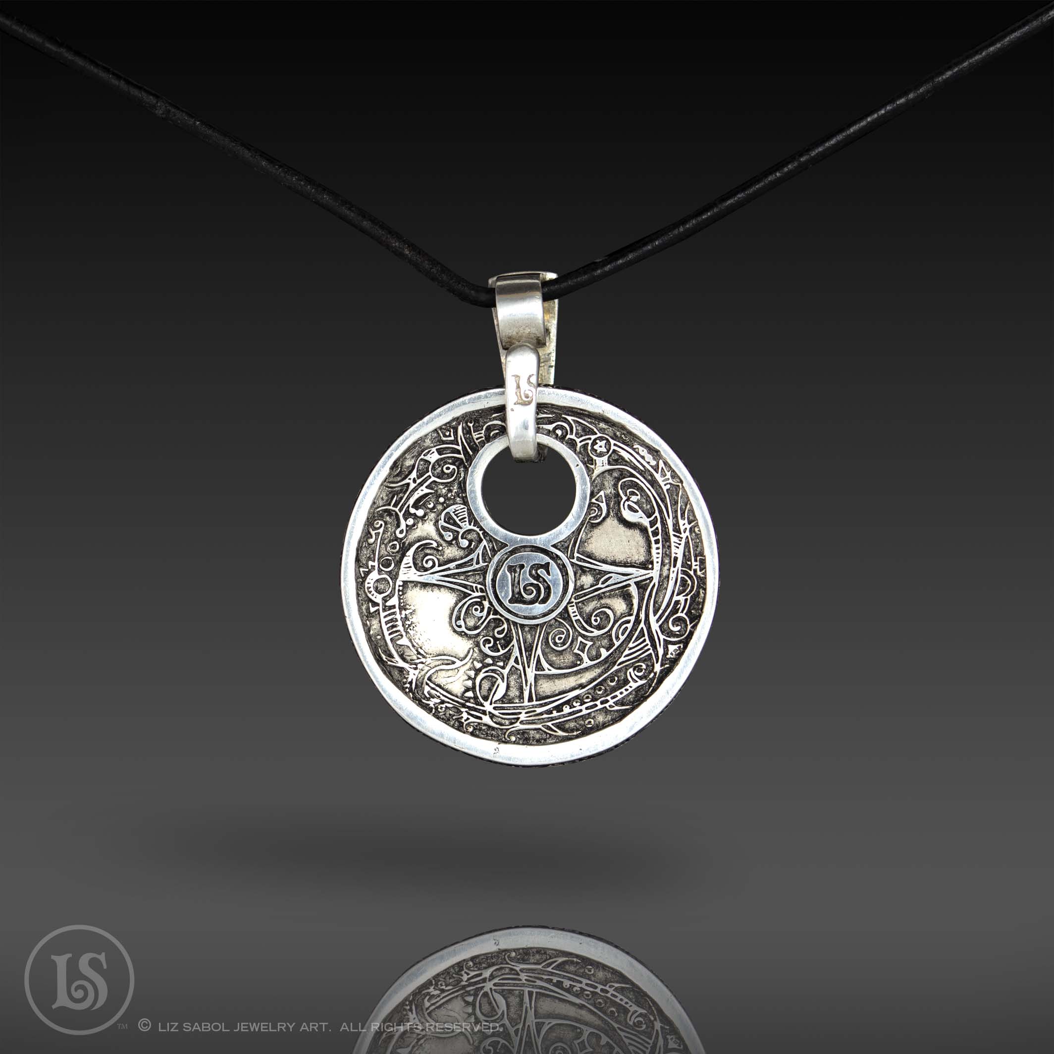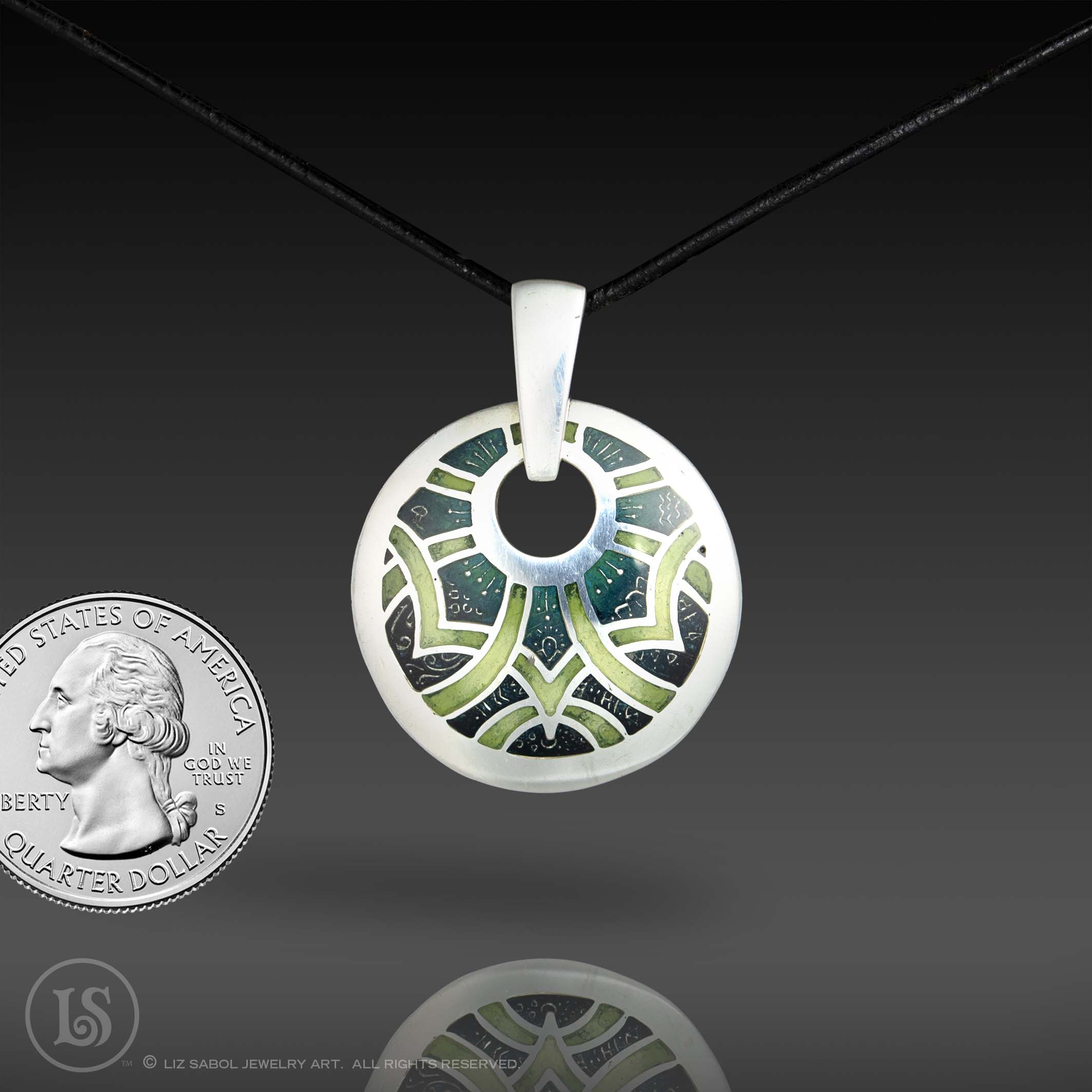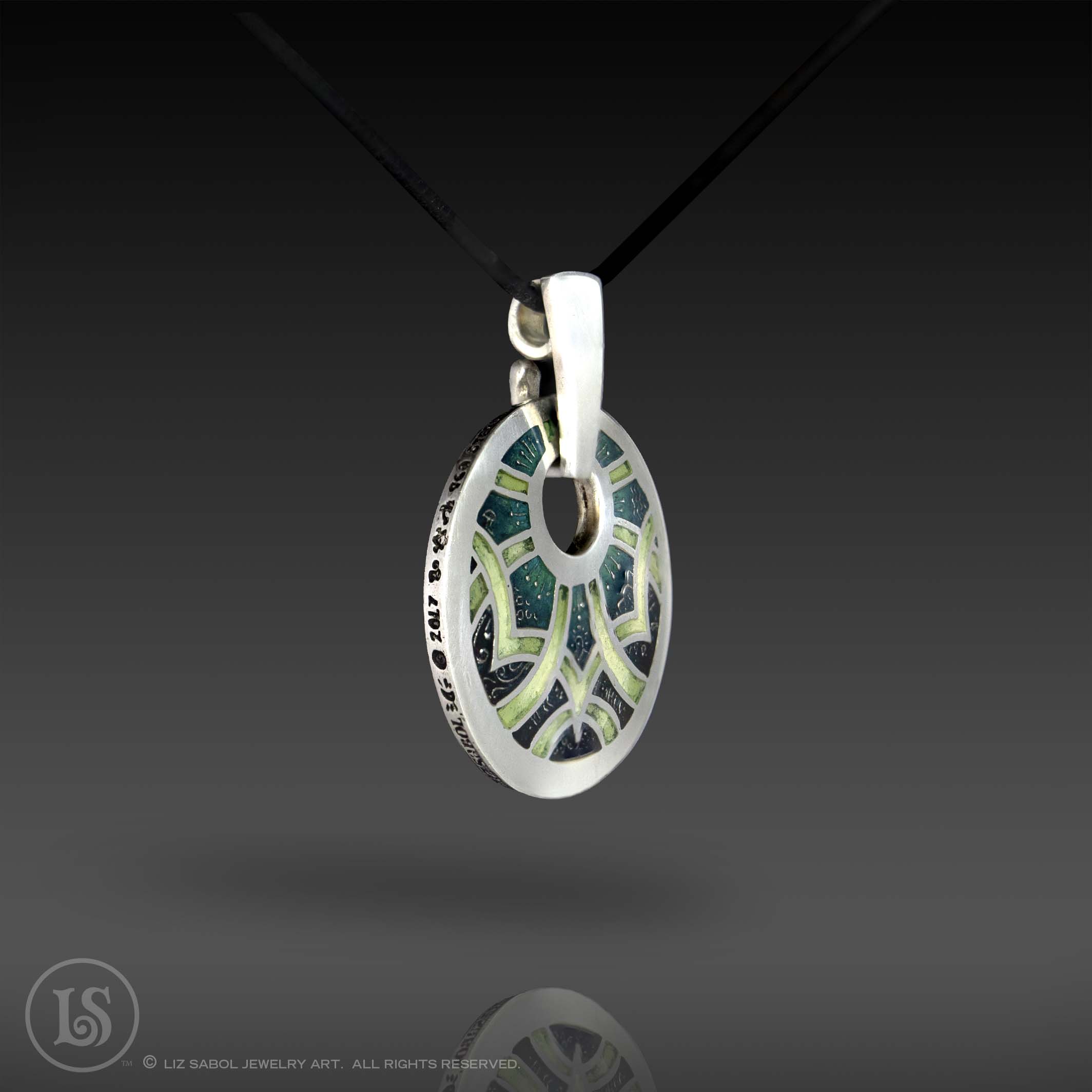 This pendant is hand-crafted in 960 sterling silver metal clay, hand-painted and filled with resin. The resin is sanded flush and re-polished.
