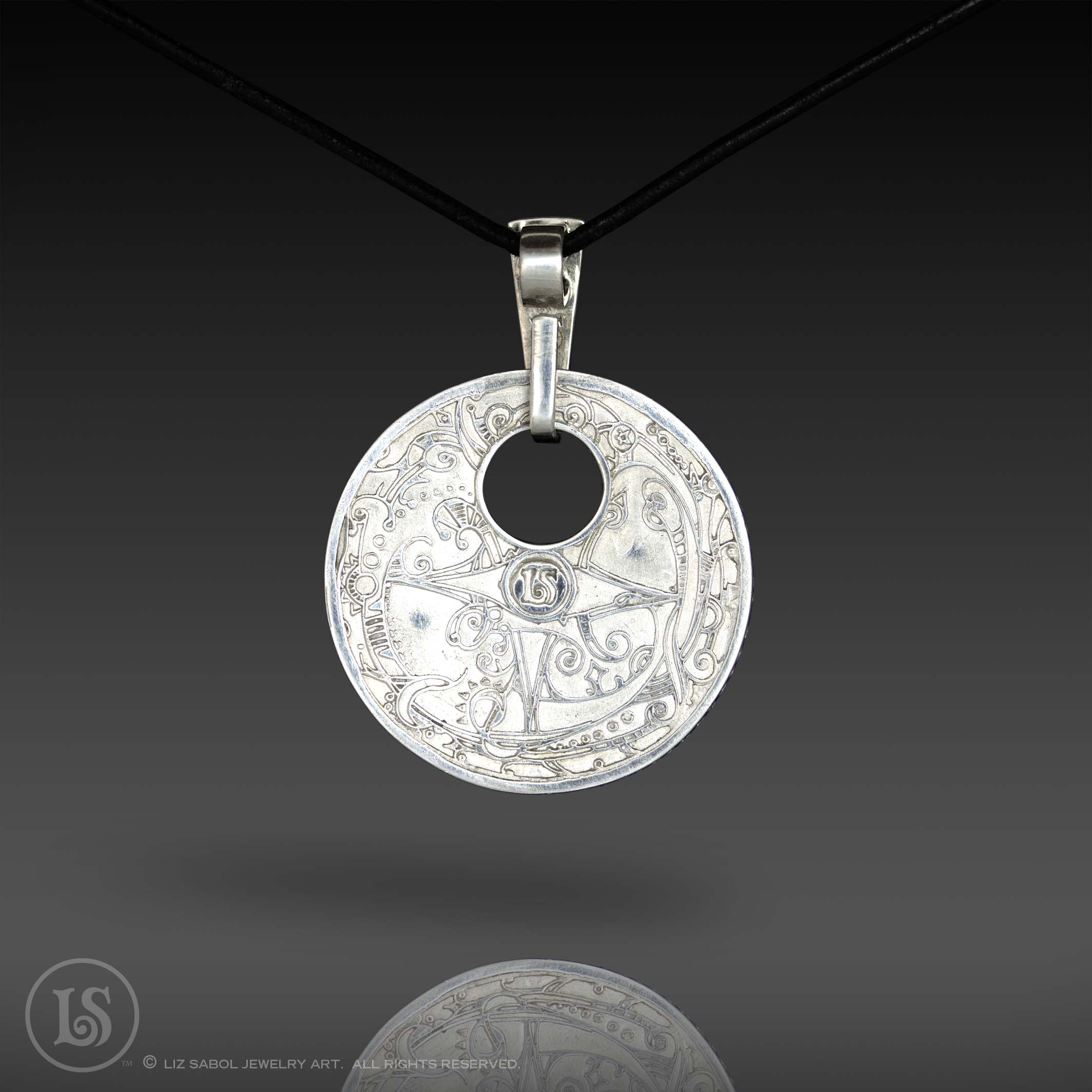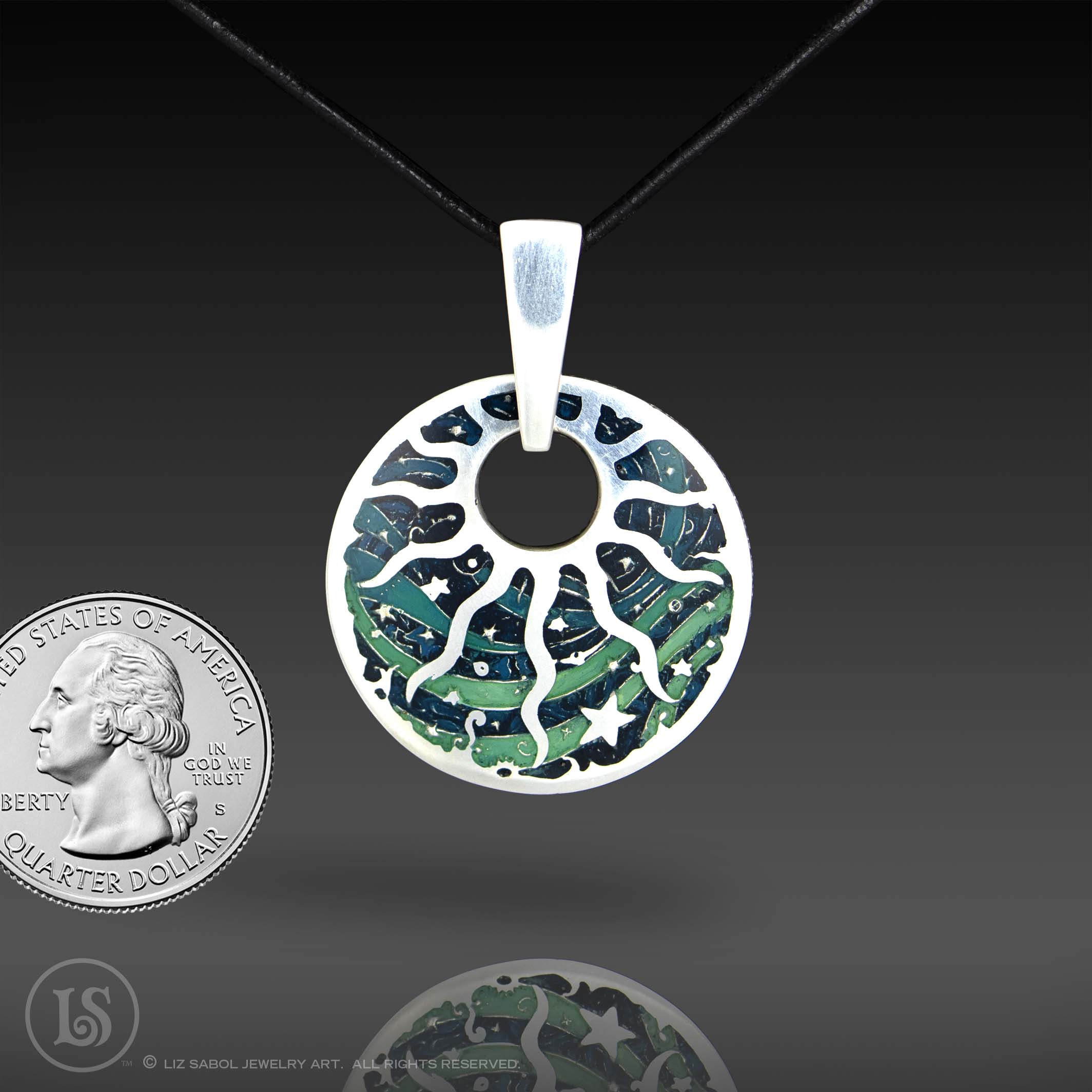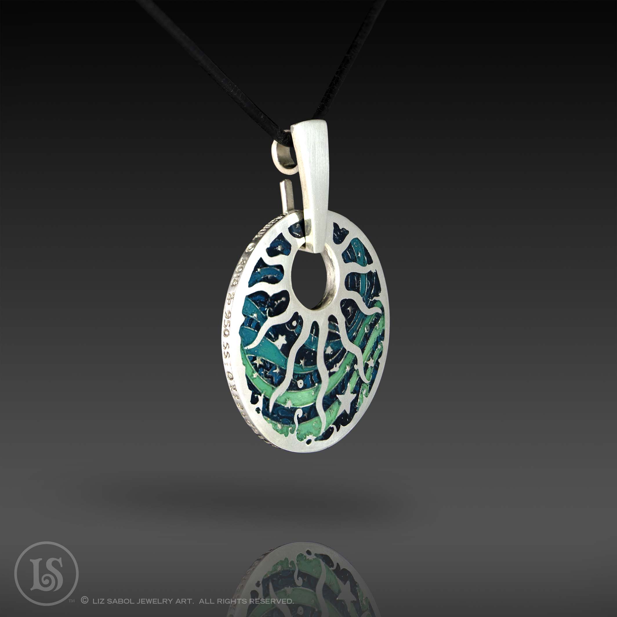 This pendant is hand-crafted in 960 sterling silver metal clay, hand-painted and filled with resin.  The resin is sanded flush and re-polished.   The edge is decorated with the symbols of the planets and astrology.