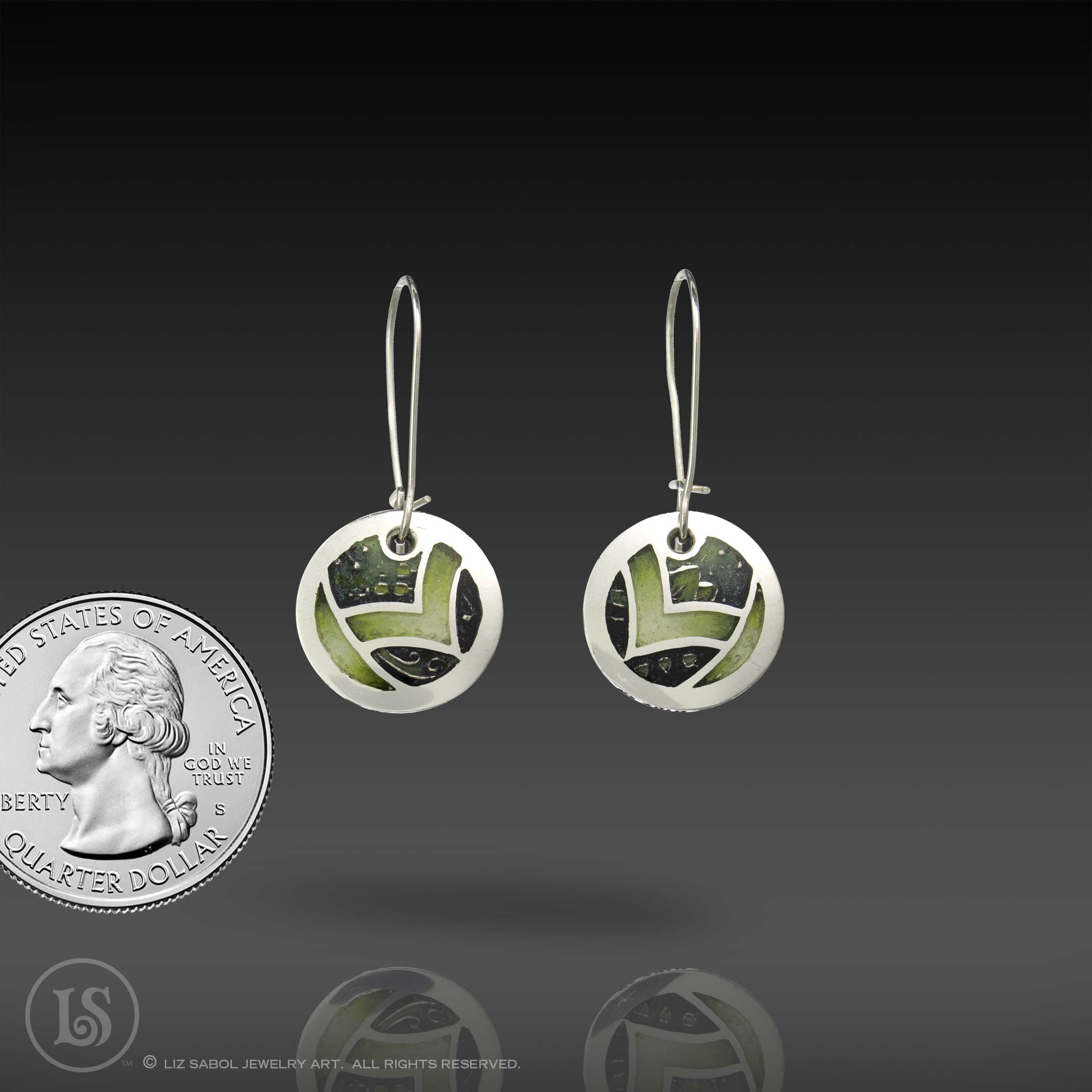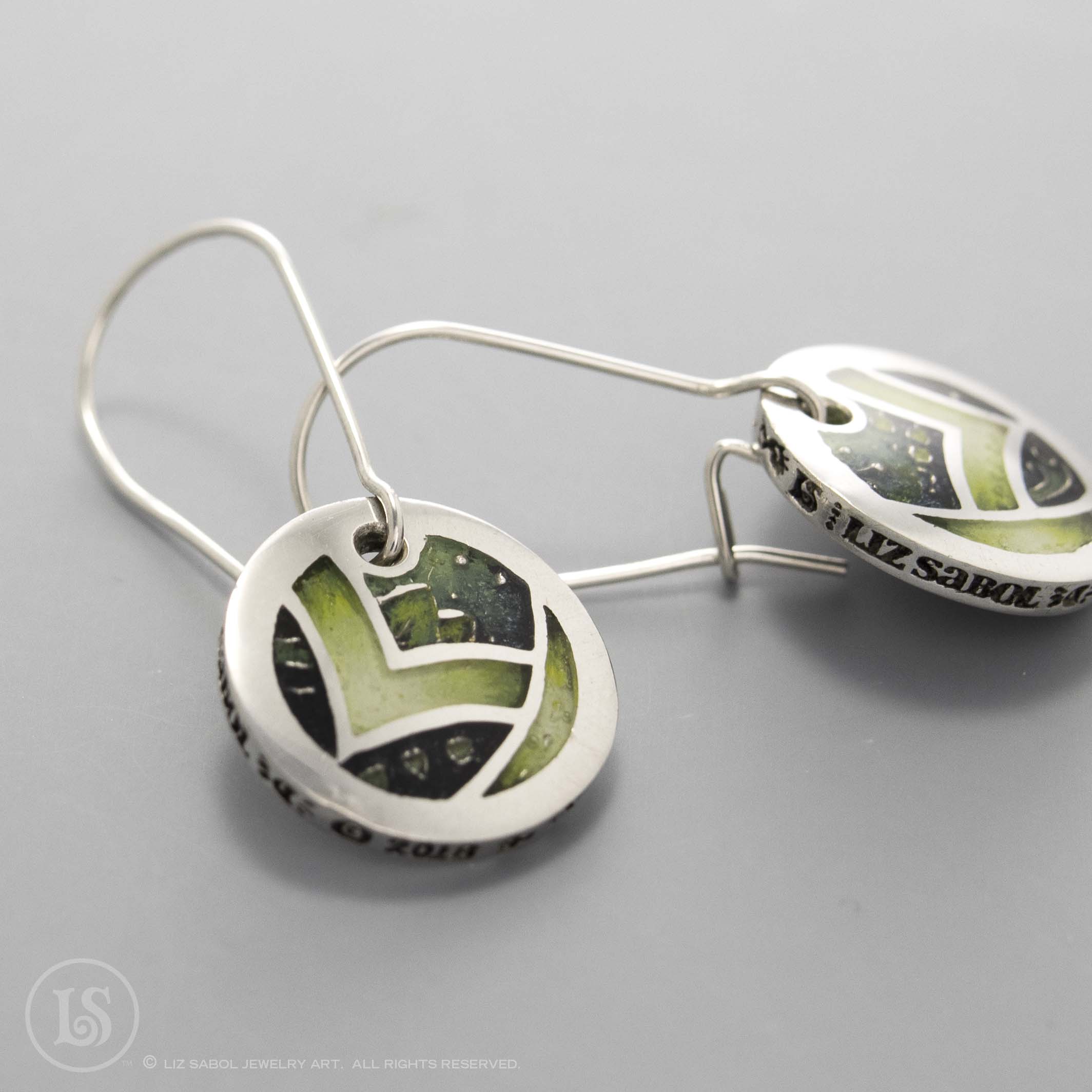 These earrings are hand-crafted in 960 sterling silver metal clay, hand-painted and filled with resin.  The resin is sanded flush and re-polished.  The design is based on my Dreamweaver 2018 Saul Bell Design Award winning collection. These earrings feature runes and branding details on the outer edge of the earrings.  The kidney earwires are 925 sterling silver and the wire thickness is 21 gauge.  There is a hook in the back, providing a secure closure to prevent loss. They are lightweight for comfortable wearing.
