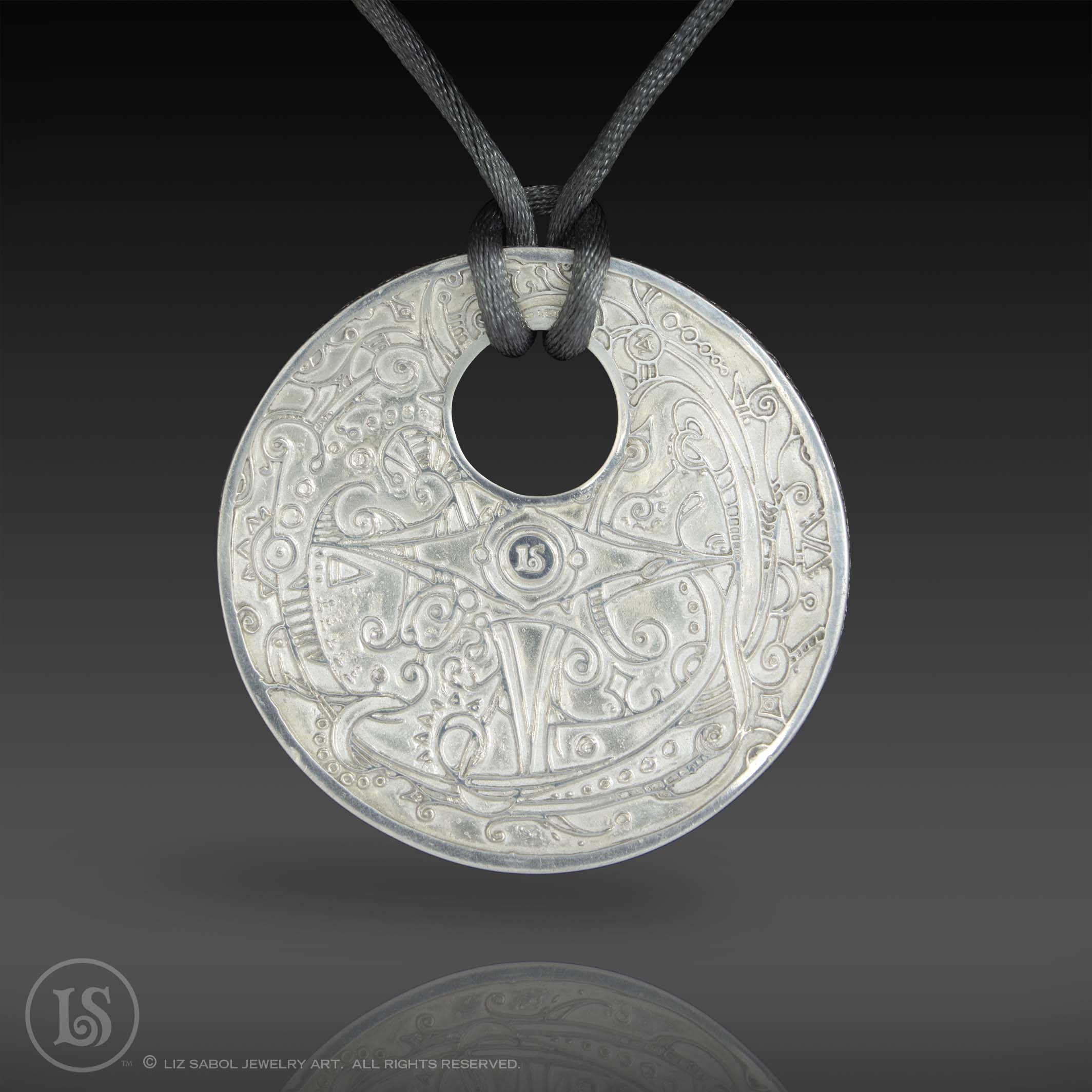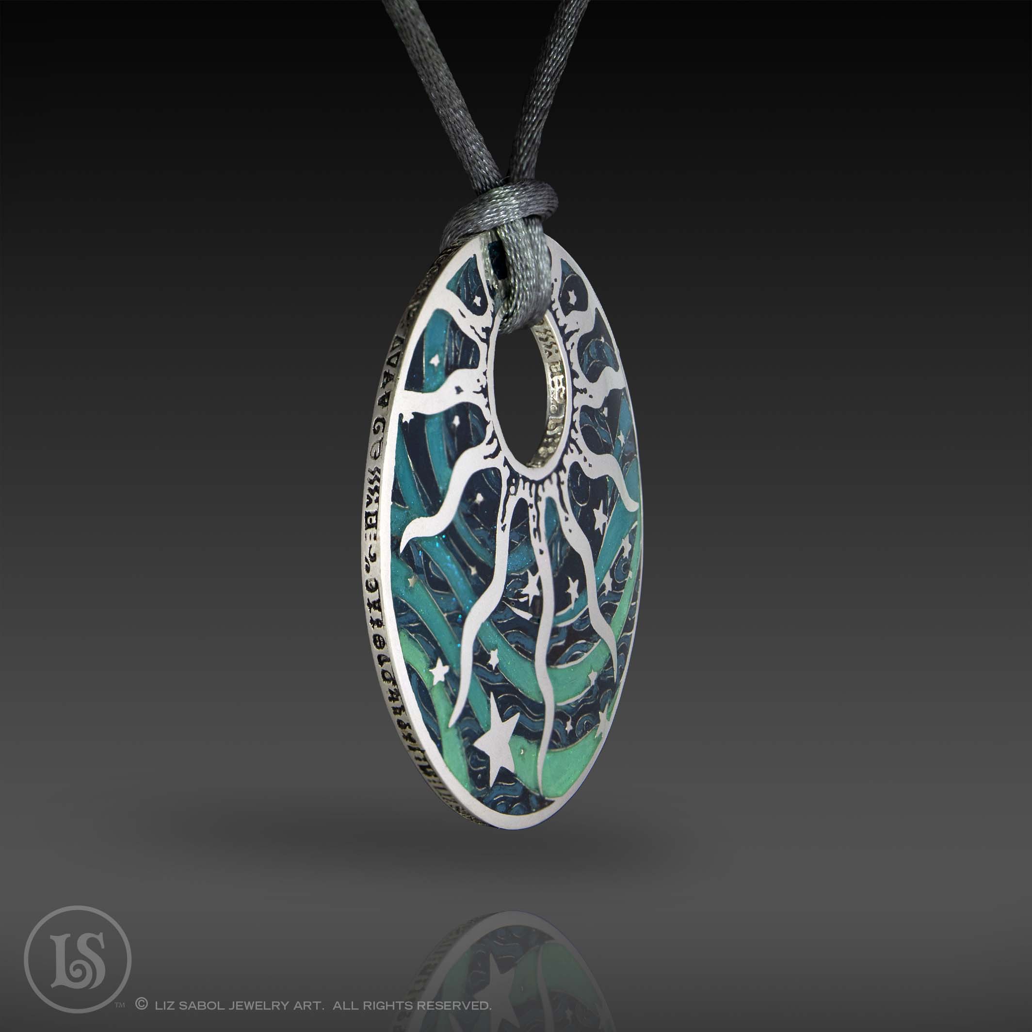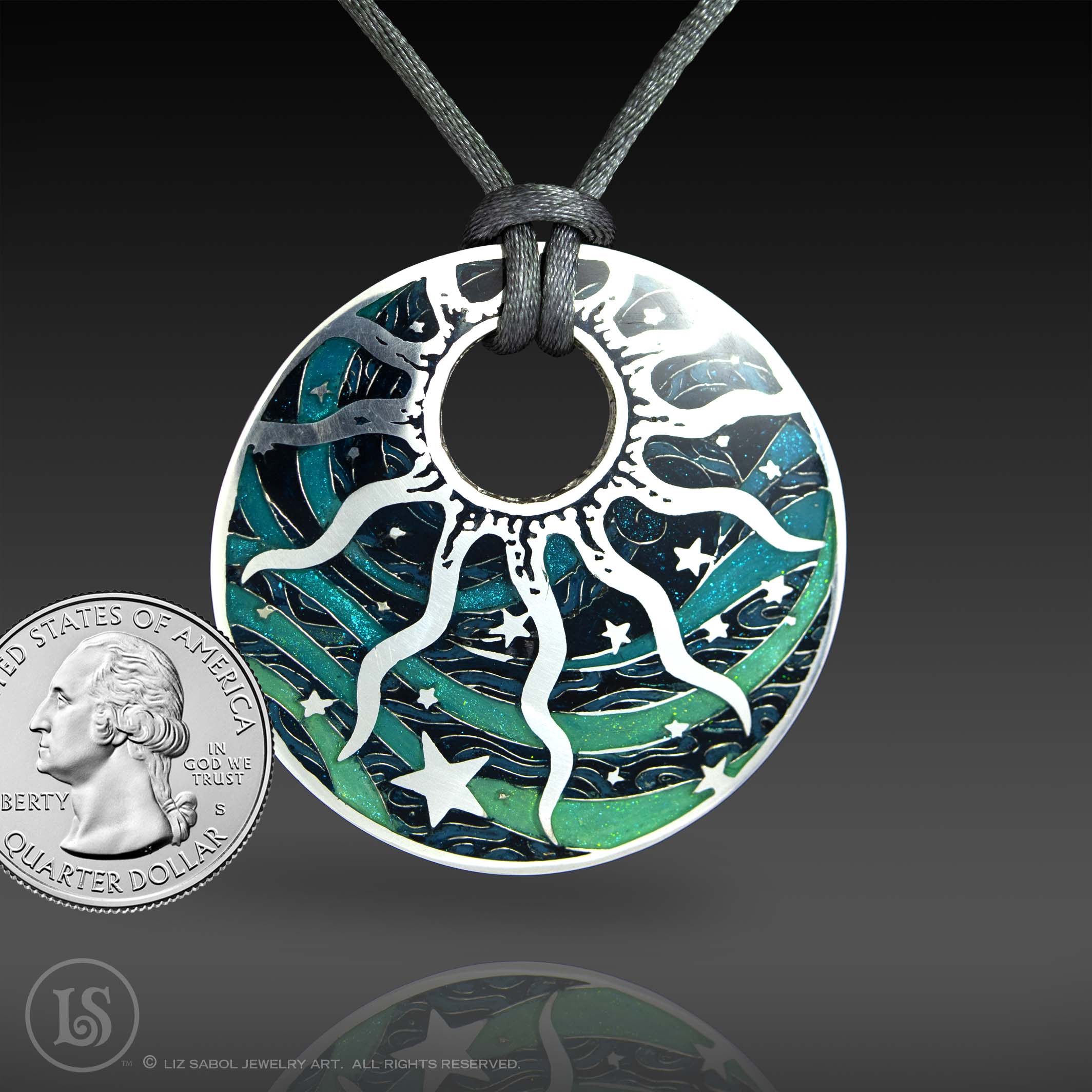 This pendant is hand-crafted in 960 sterling silver metal clay, hand-painted and filled with resin.  The resin is sanded flush and re-polished.   The edge is decorated with the symbols of the planets and astrology.