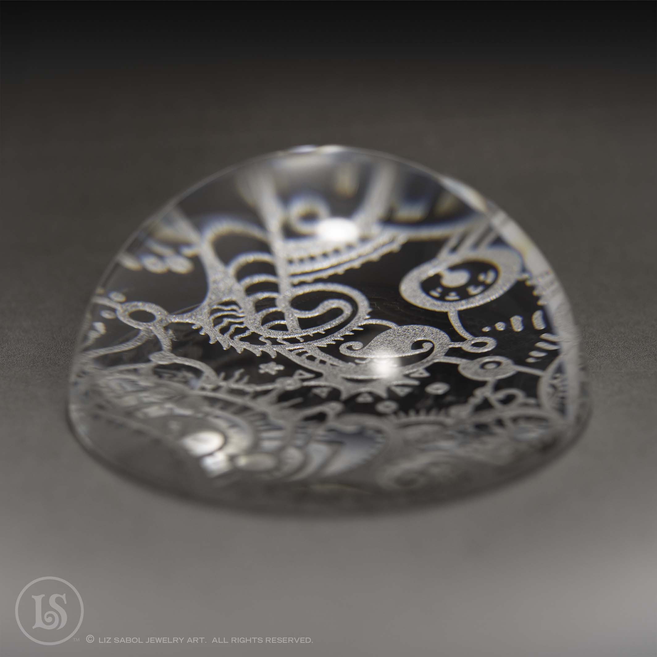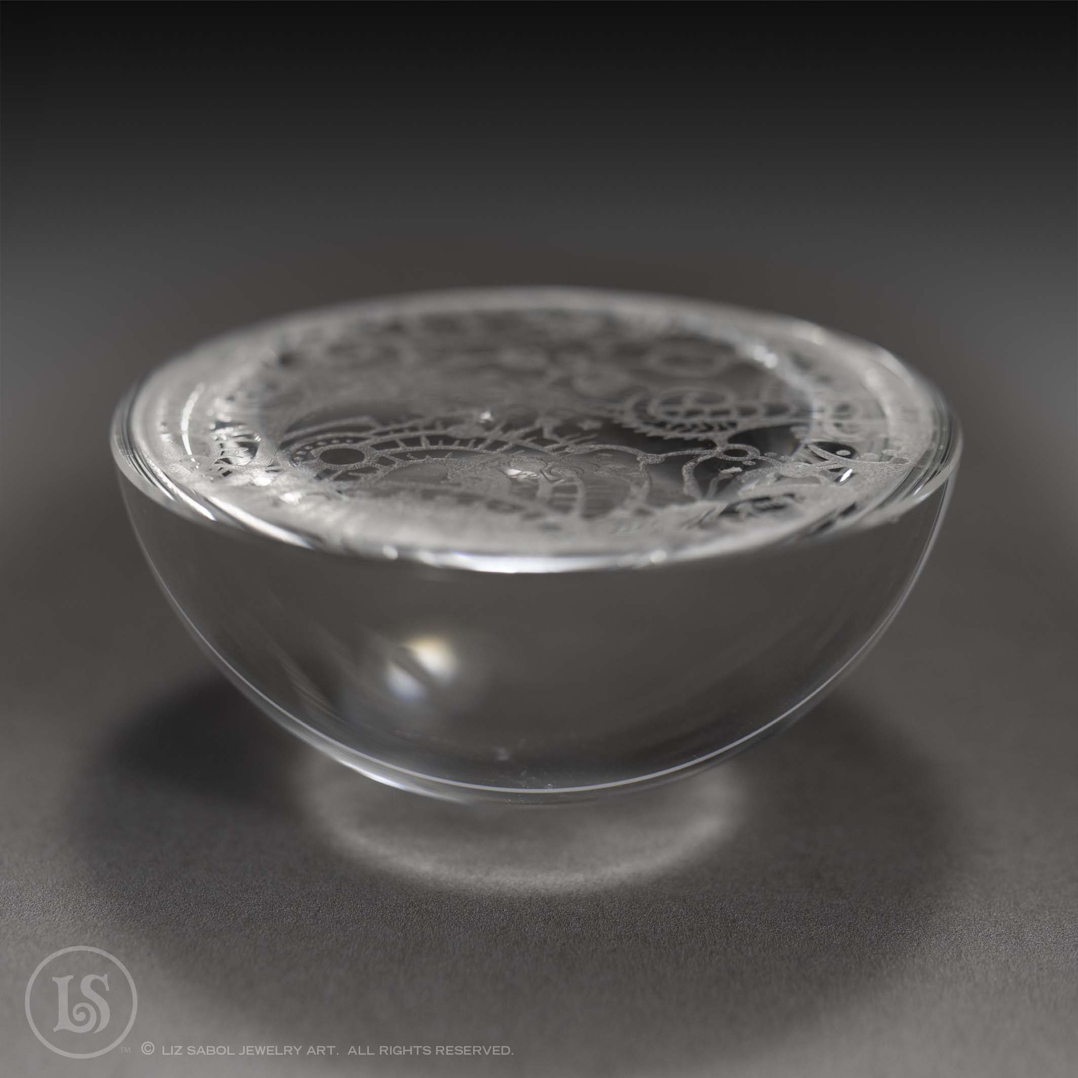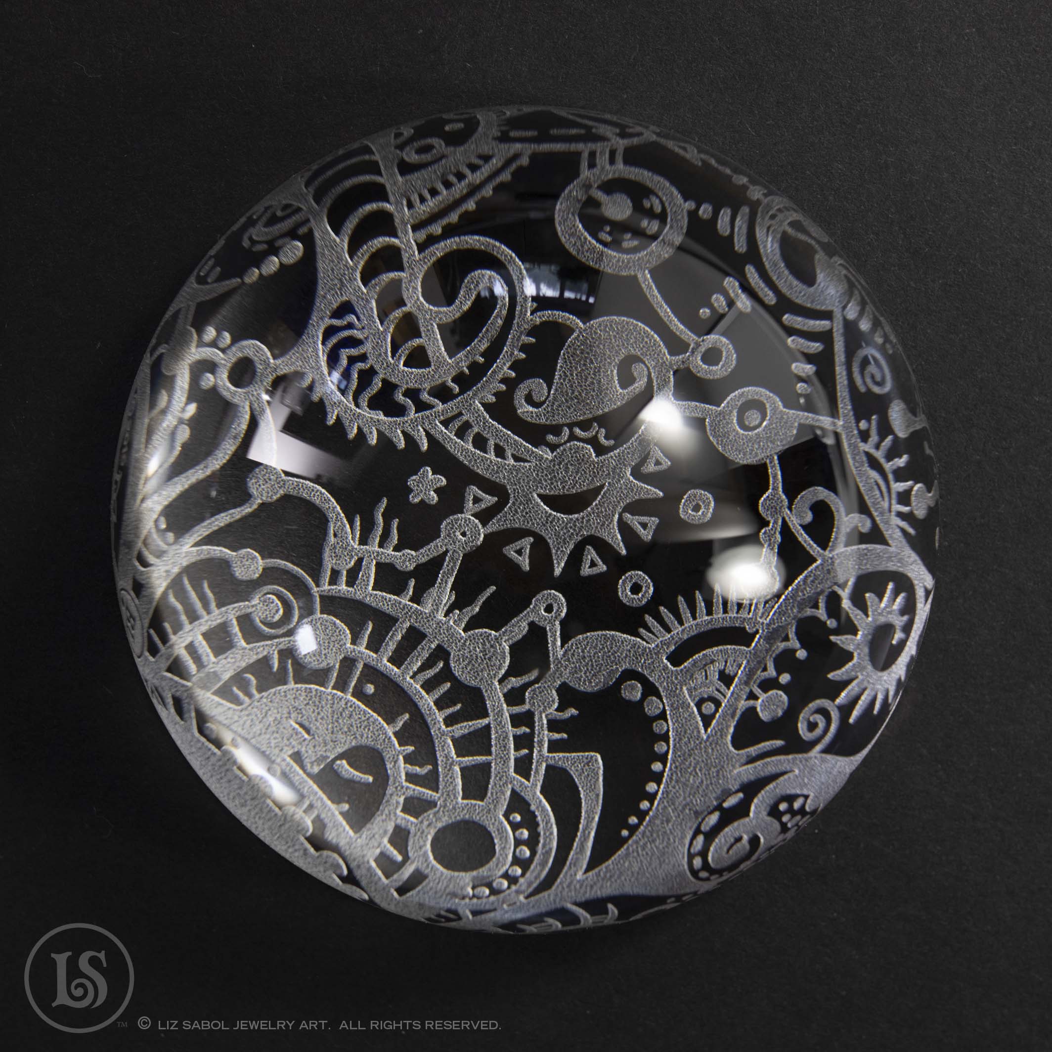 Crystal clear domed glass paperweight. Etched on the bottom with a section of my Hatter cuff design.