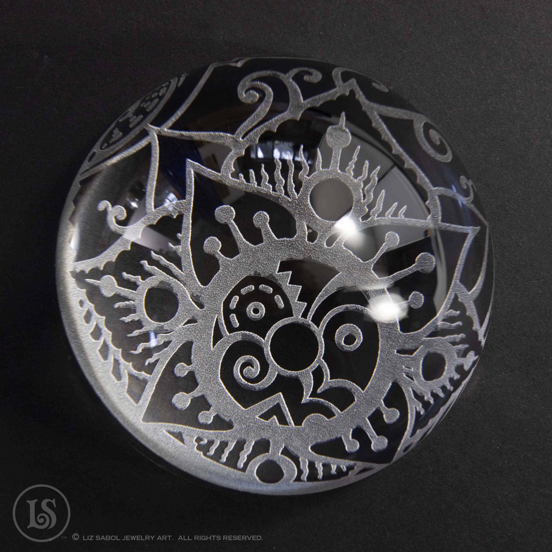 Crystal clear domed glass paperweight. Etched on the bottom with a section of my Passion flower design.