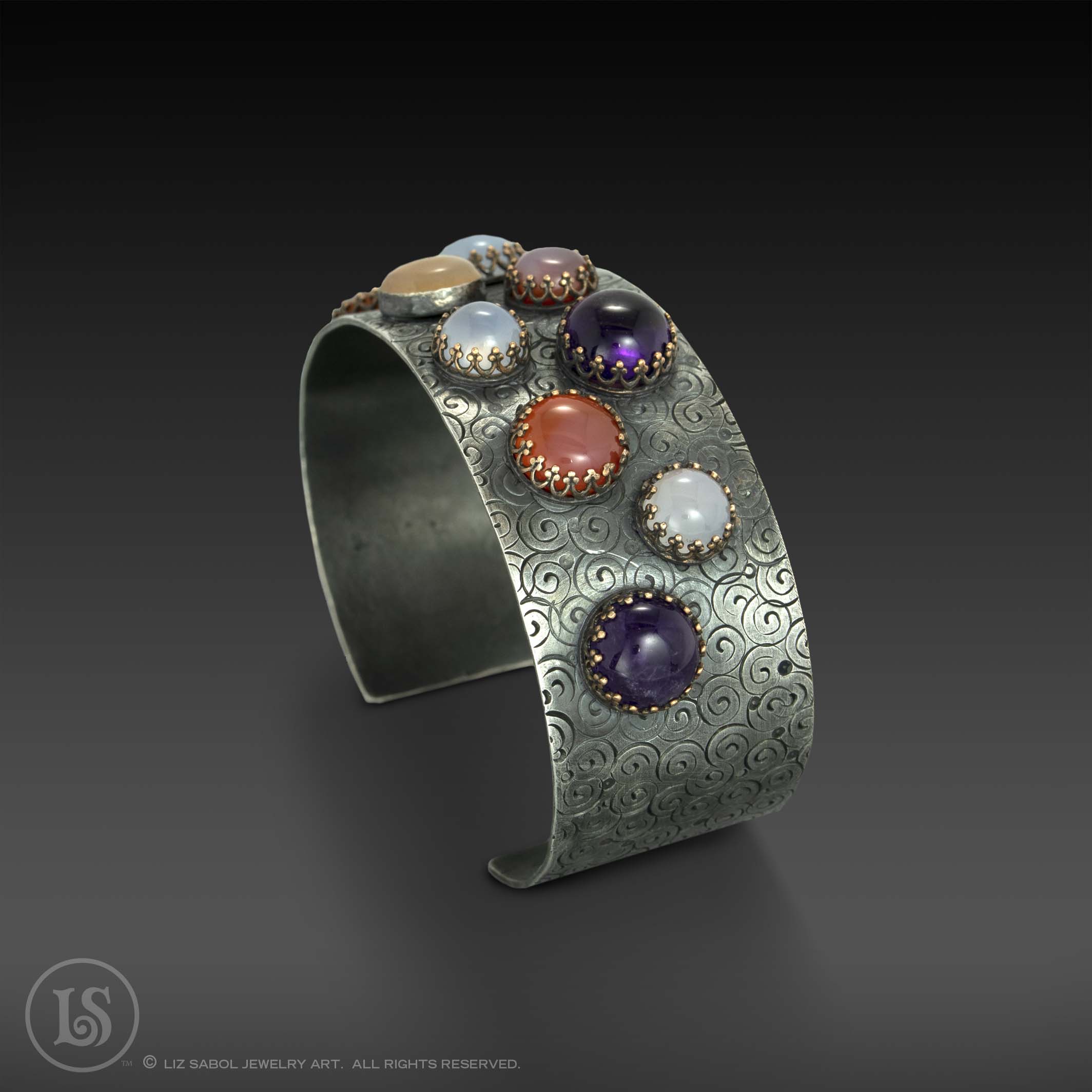 Sterling cuff with various stones. Spiral texture. 7.25"