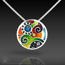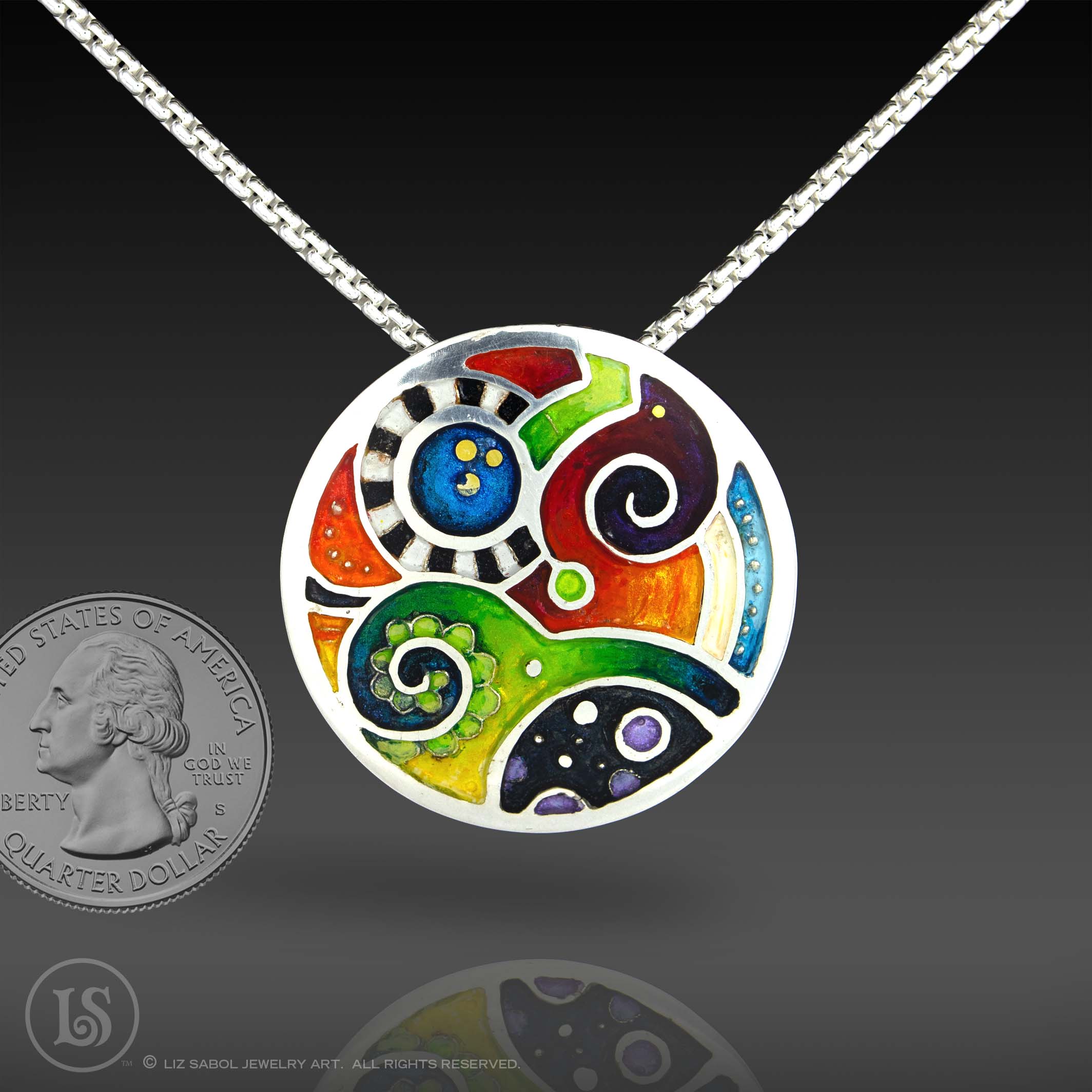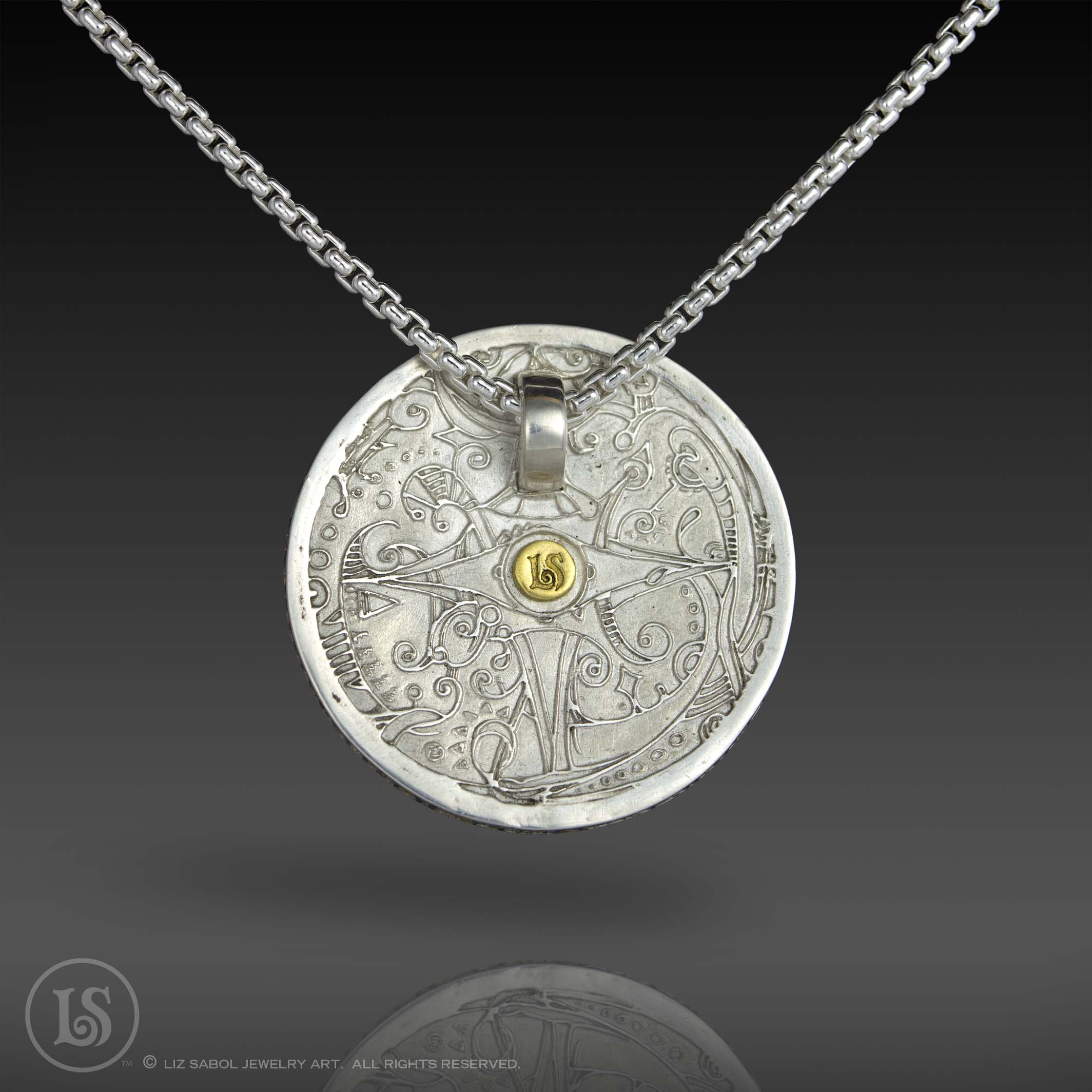 I made this pendant as a example piece for a master class I teach. It is hand-crafted in 960 sterling silver metal clay, 22K gold accent, hand-painted and filled with resin.  The resin is sanded flush and re-polished.   The edge is decorated with the symbols of the planets and astrology.