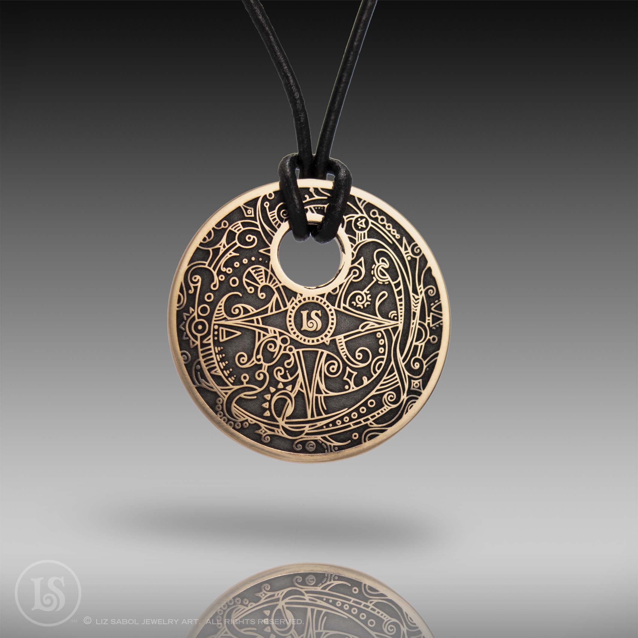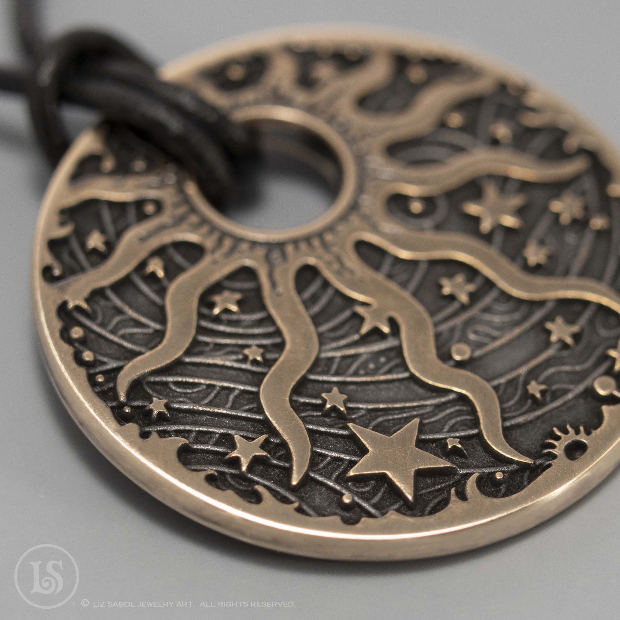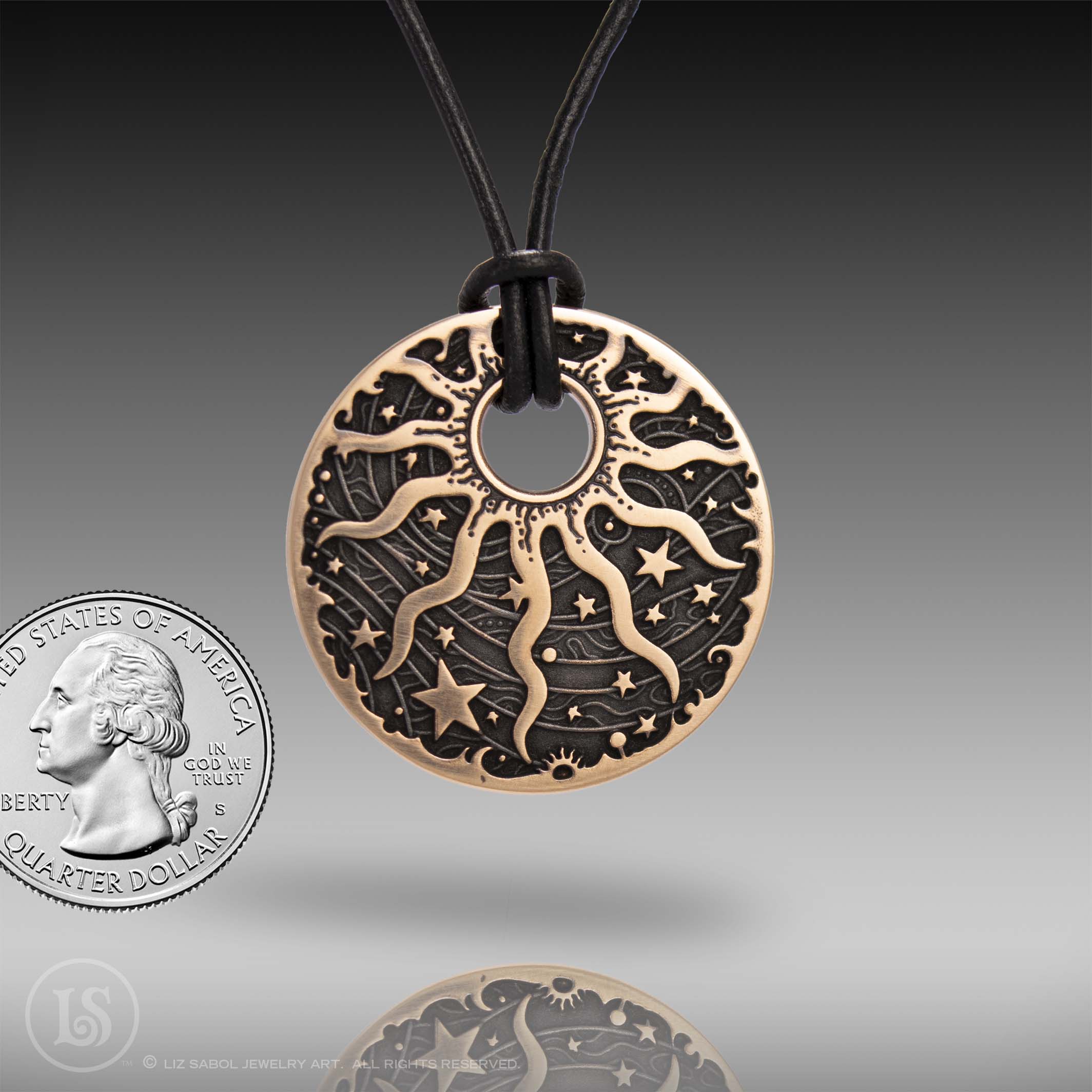 Solid copper pendant with my Celestial Sun design in deep relief. Patina applied for contrast. 18" Leather cord included. This is un-sealed copper, and will tarnish over time. Polishing cloth is included. Cleaning this pendant in any chemical cleaning liquid will remove the patina.