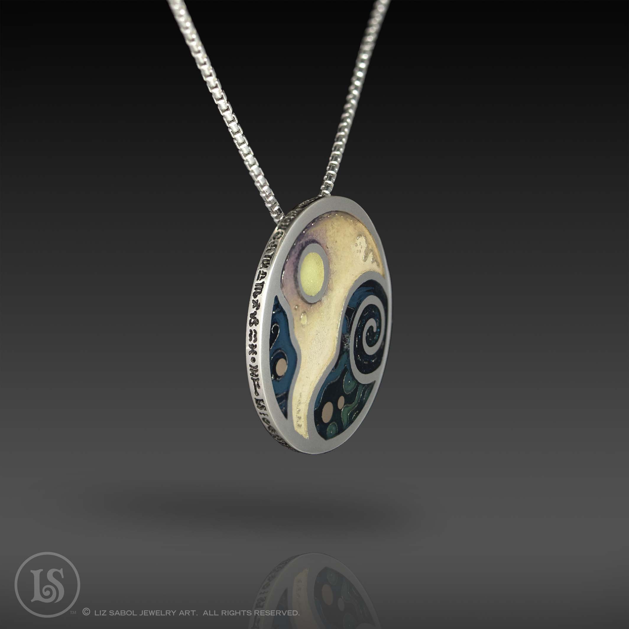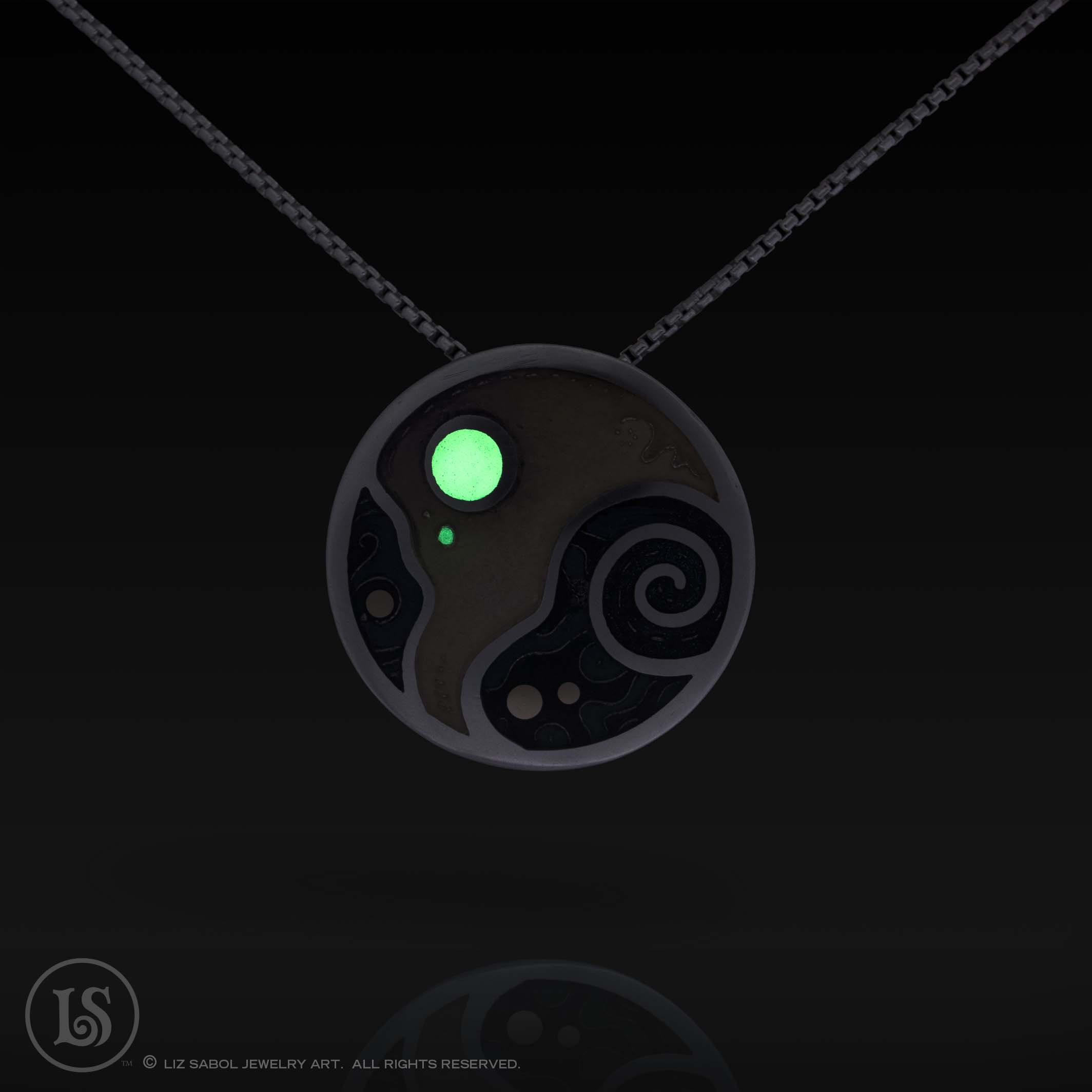 JUPITER: Inspired by images captured by NASA's Juno mission to Jupiter. Jupiter's auroras are interpreted with glow-in-the-dark accents. Hand-painted Champleve - oil paint and resin on 950 sterling with 14K gold accents.