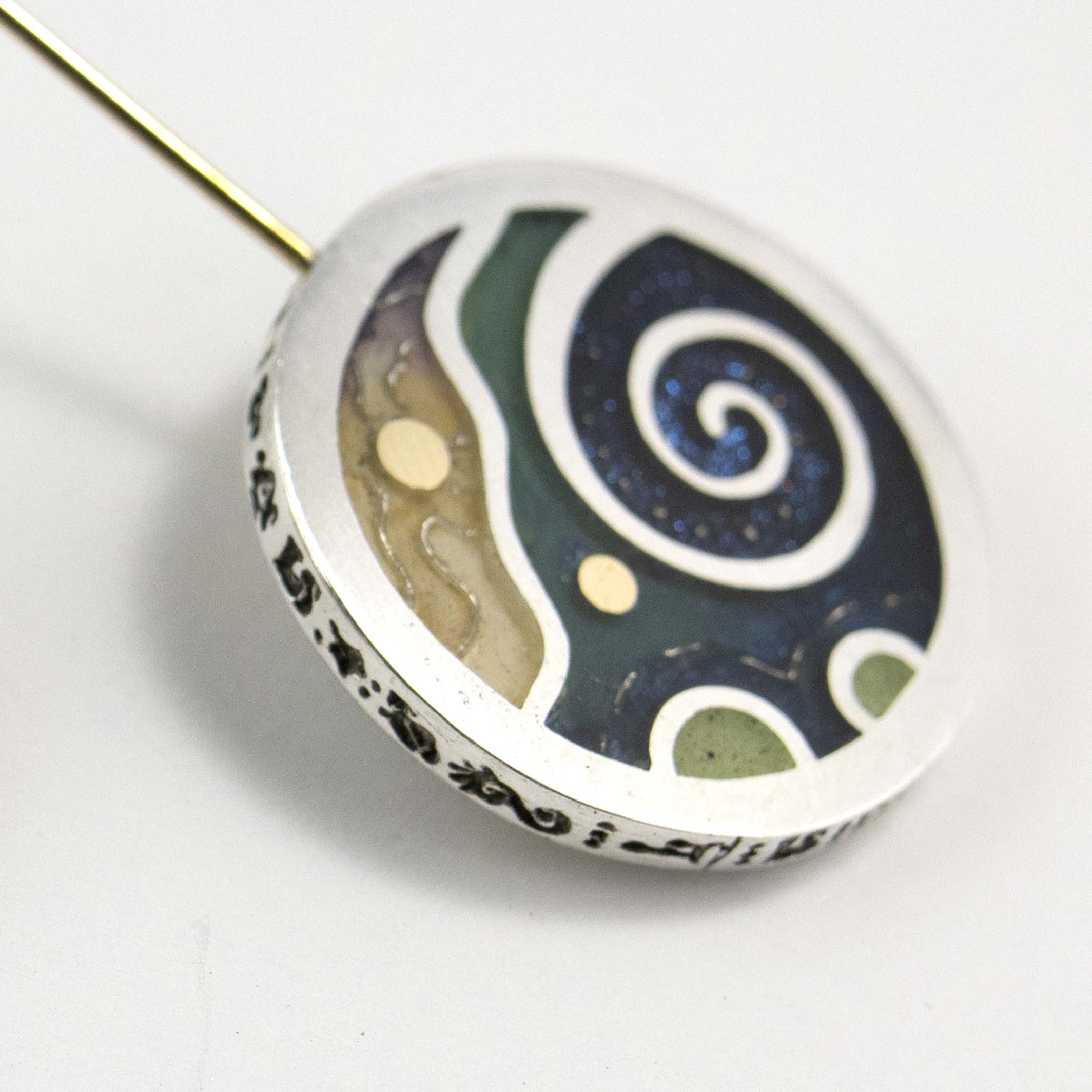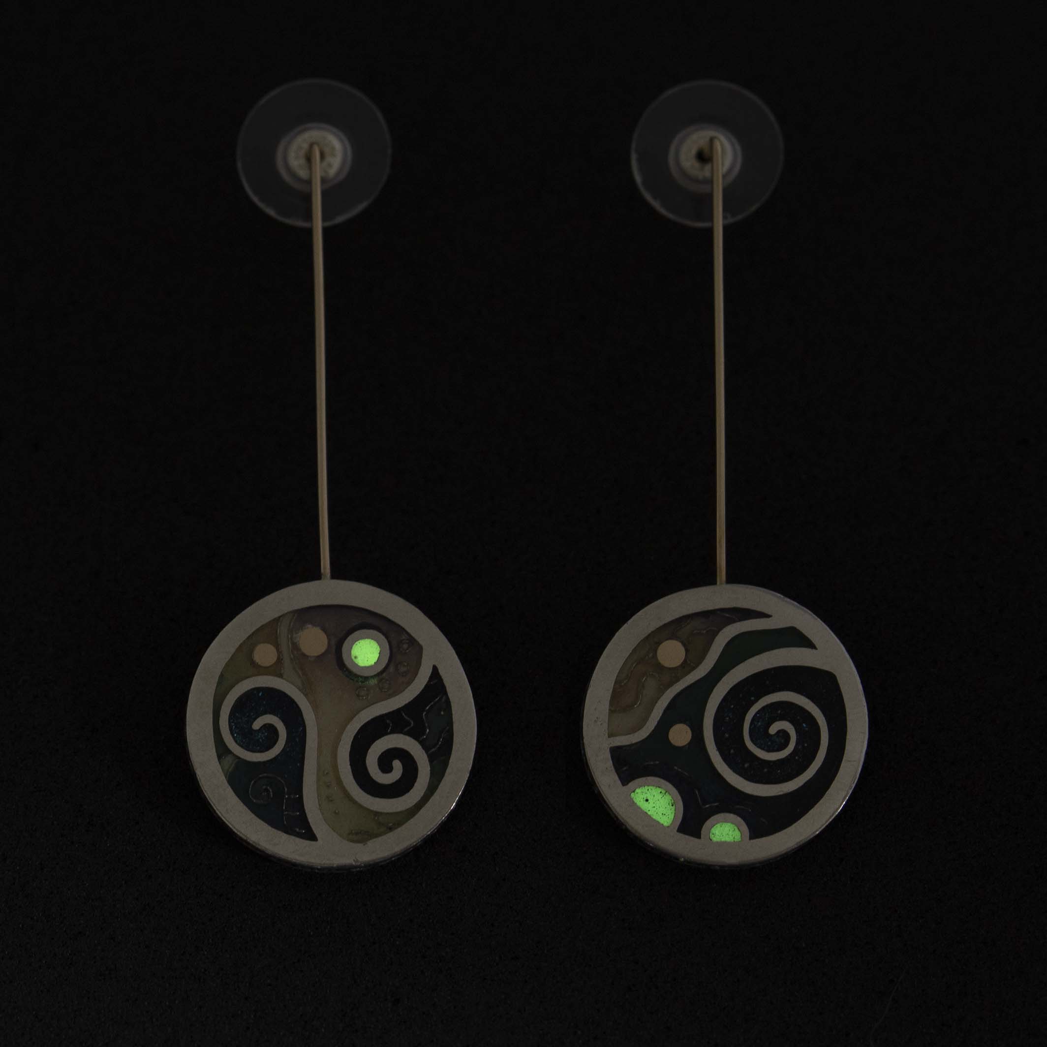 JUPITER: Inspired by images captured by NASA's Juno mission to Jupiter. Jupiter's auroras interpreted with glow-in-the-dark accents. Hand-painted Champleve - oil paint and resin on 950 sterling with 14K gold accents.