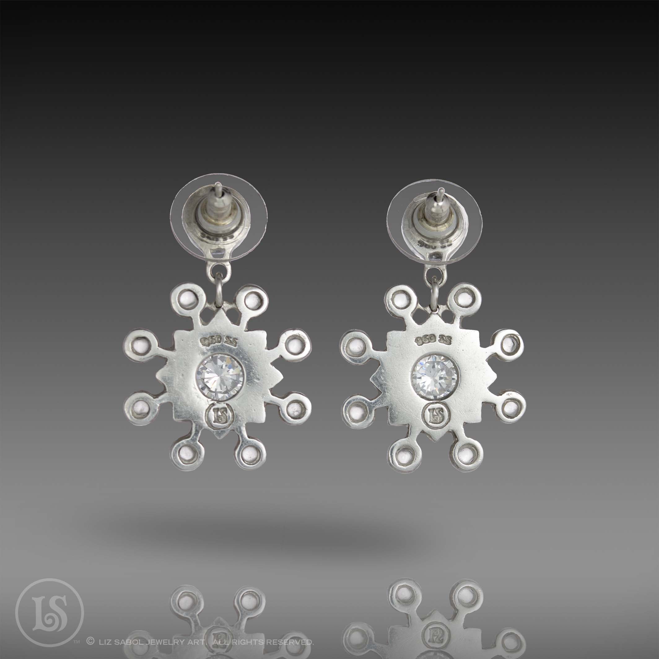 These earrings are hand-crafted in 960 sterling silver metal clay, with cubic zirconia gems. They are hand-painted and filled with resin.