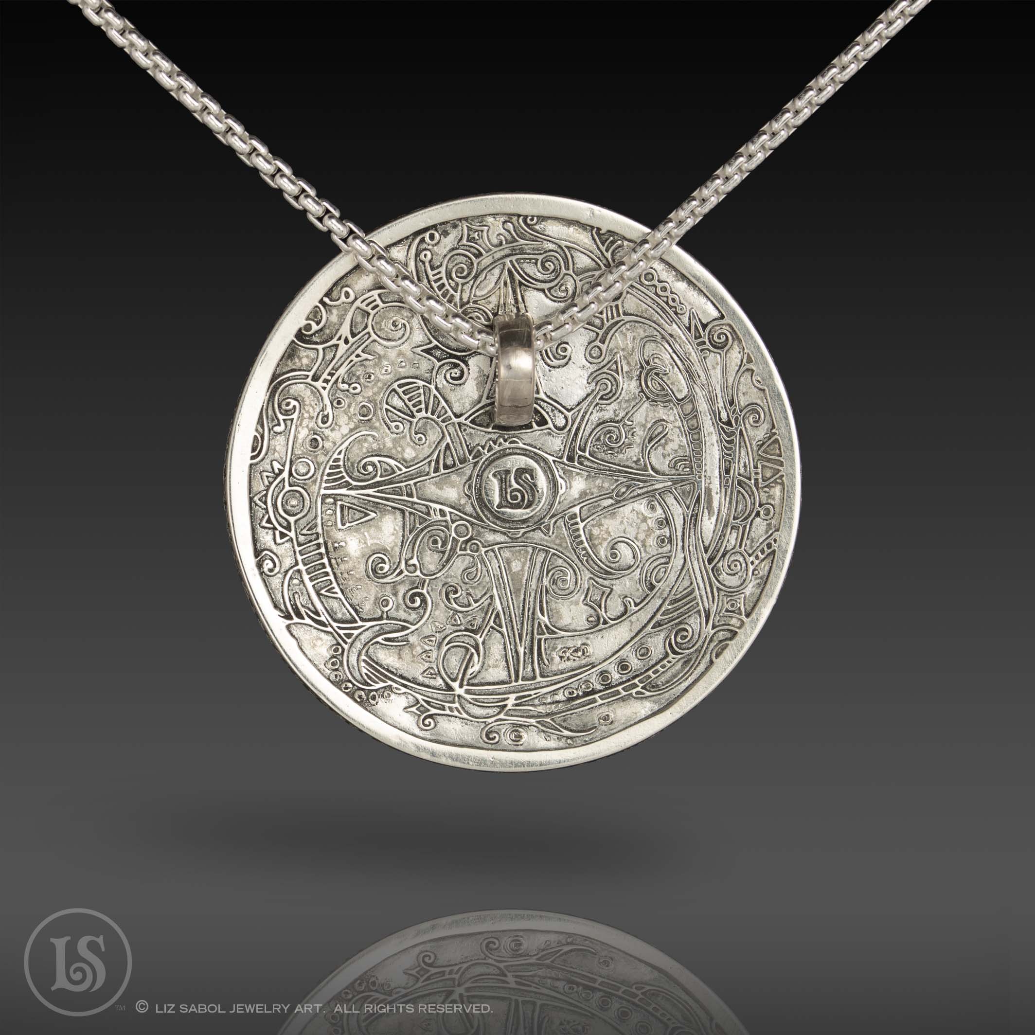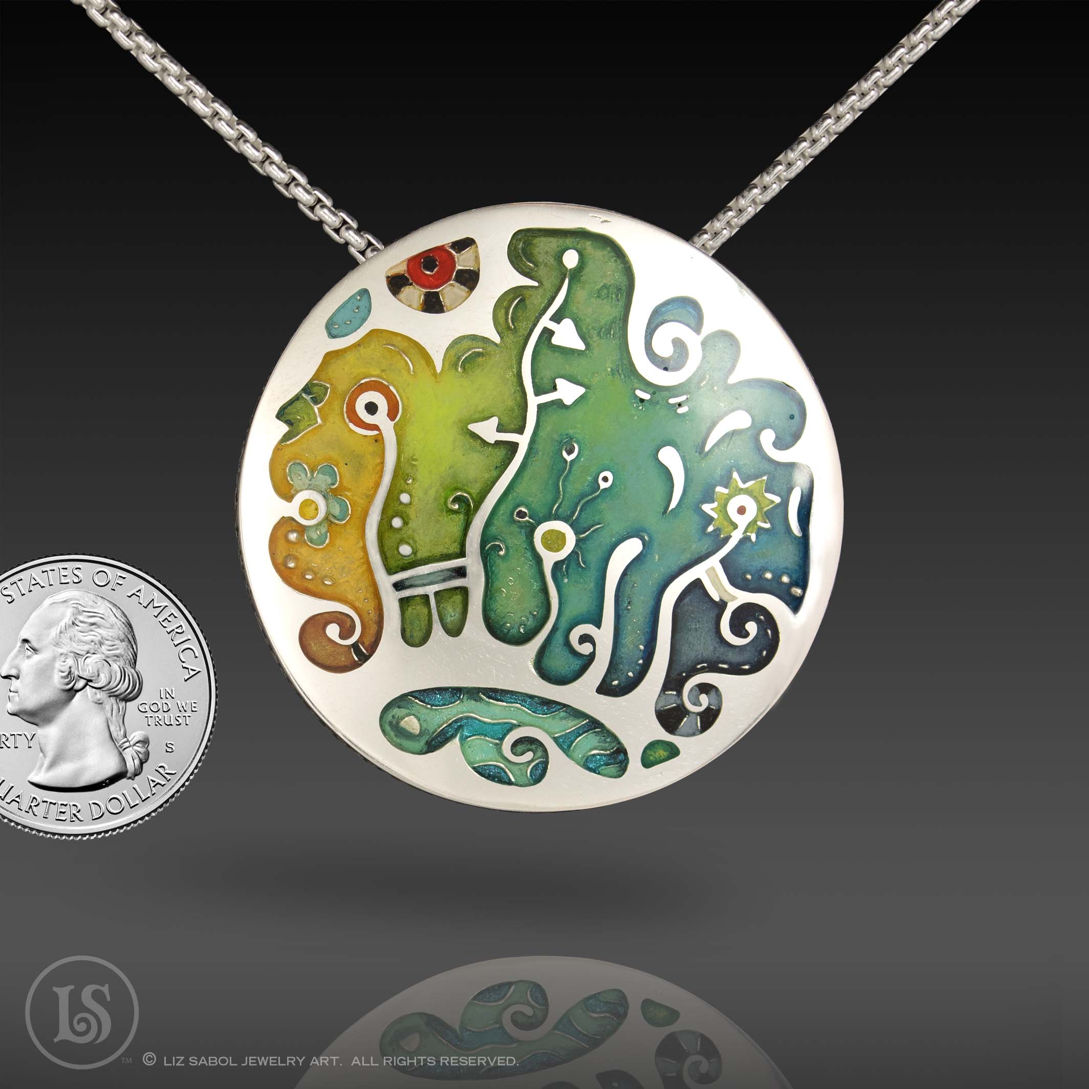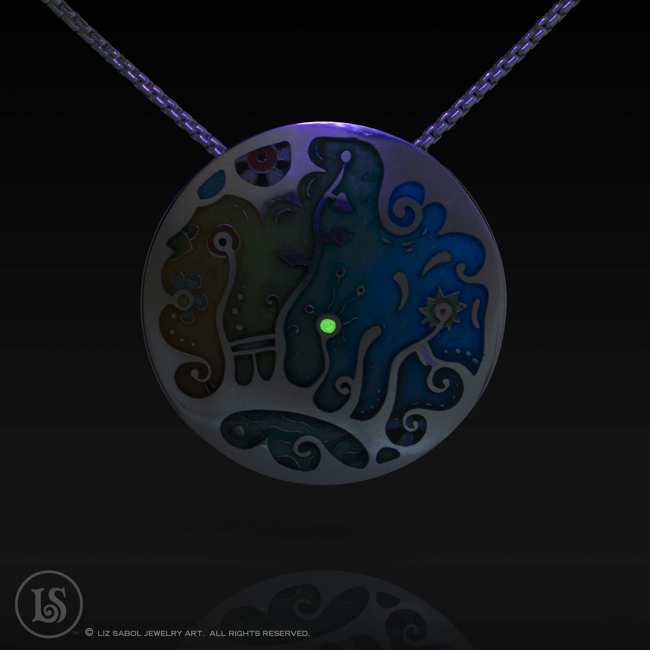 Sterling silver, Oil Paint, Resin. Hand-painted champleve. This is intricate pendant is designed in the theme of my Mad Hatter cuff. There are glow-in-the-dark accents. Planetary and Astrological symbols circle the edge. Chain not included. Hidden bail fits up to 4mm chains or cords.
