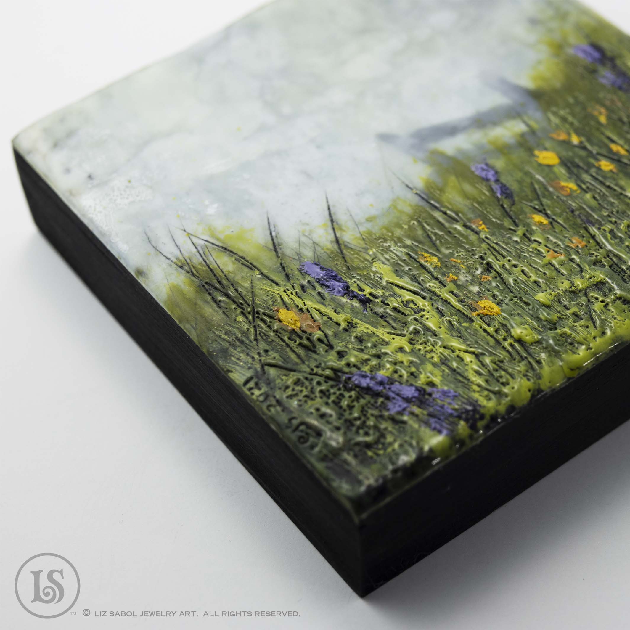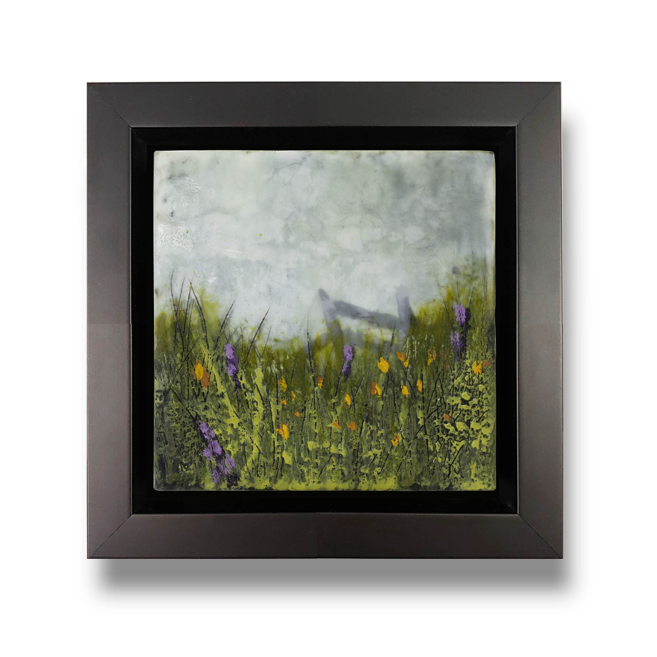 One-of-a-kind, hand-painted encaustic art. Encaustic, oils, on board. The edges and back of the board are a satin black hand finsihed oil rub. Framed. Ready to hang or set on a shelf.