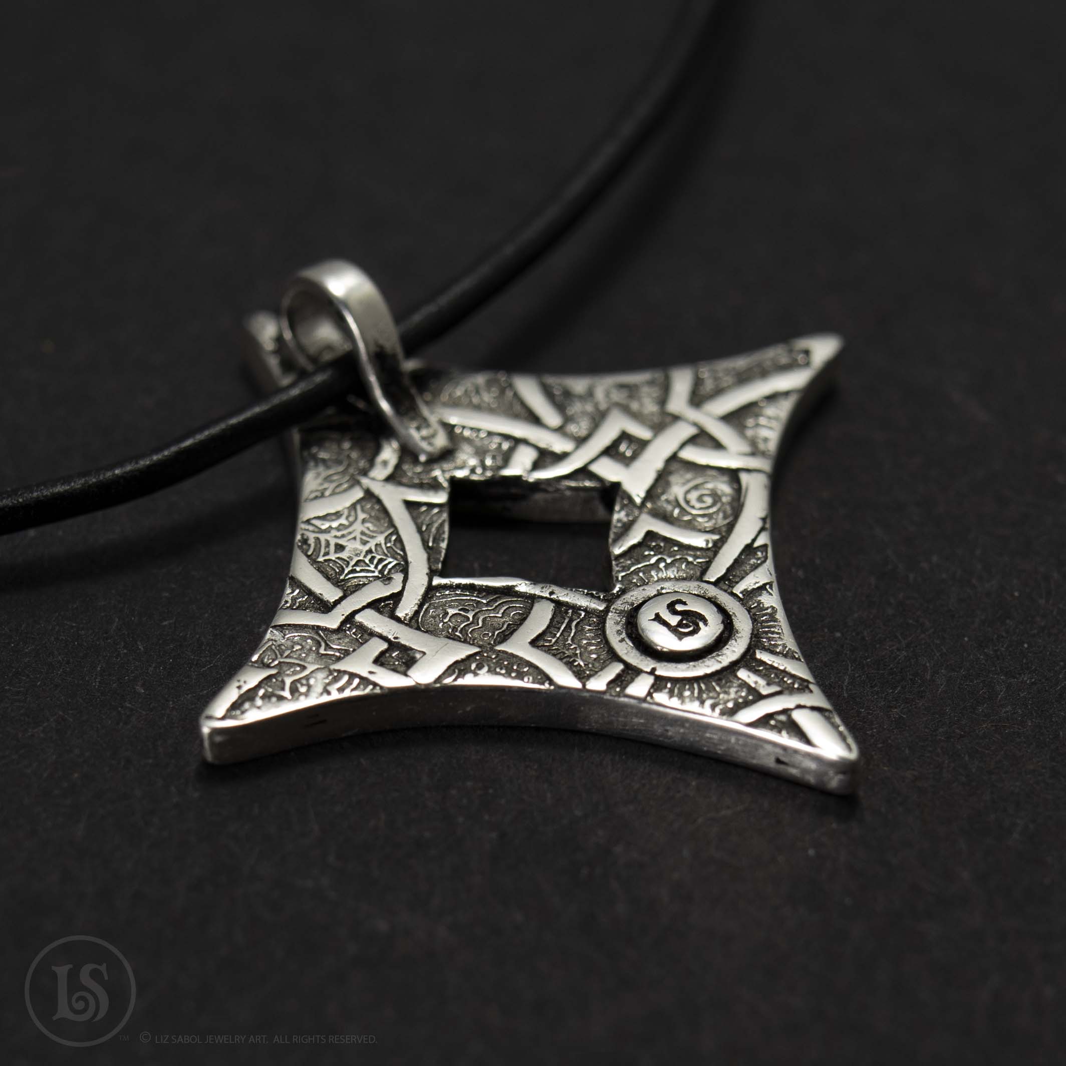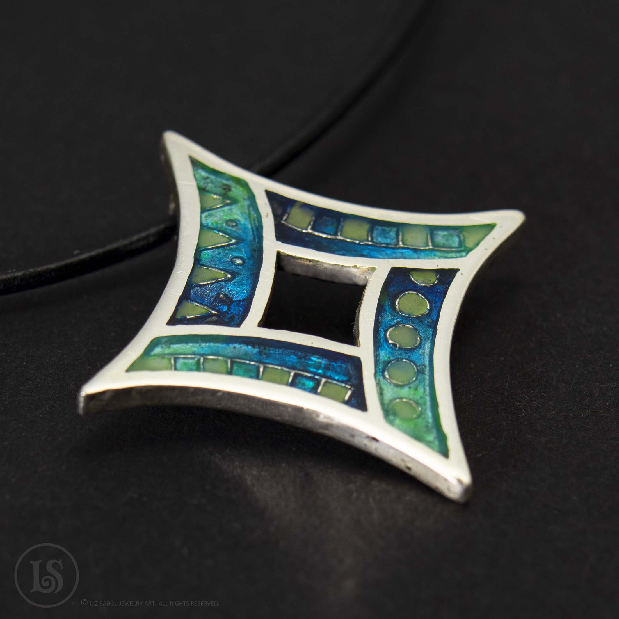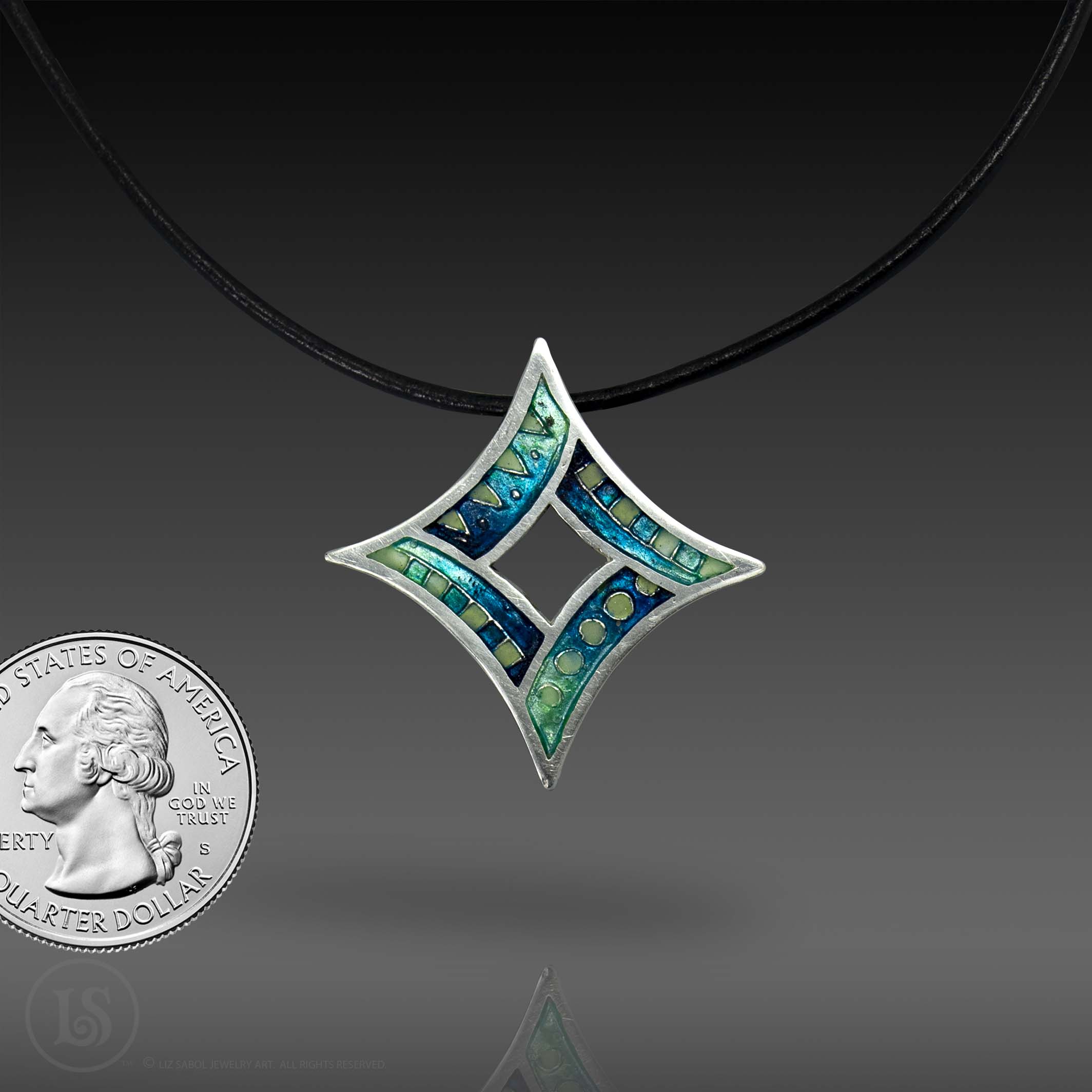Hand-painted 960 sterling silver. Hand-made, one-of-a-kind. Cold-enamel. Ink, resin, glow-in-the-dark accents. Bail fits delicate cords and chains. Cord/chain not included.