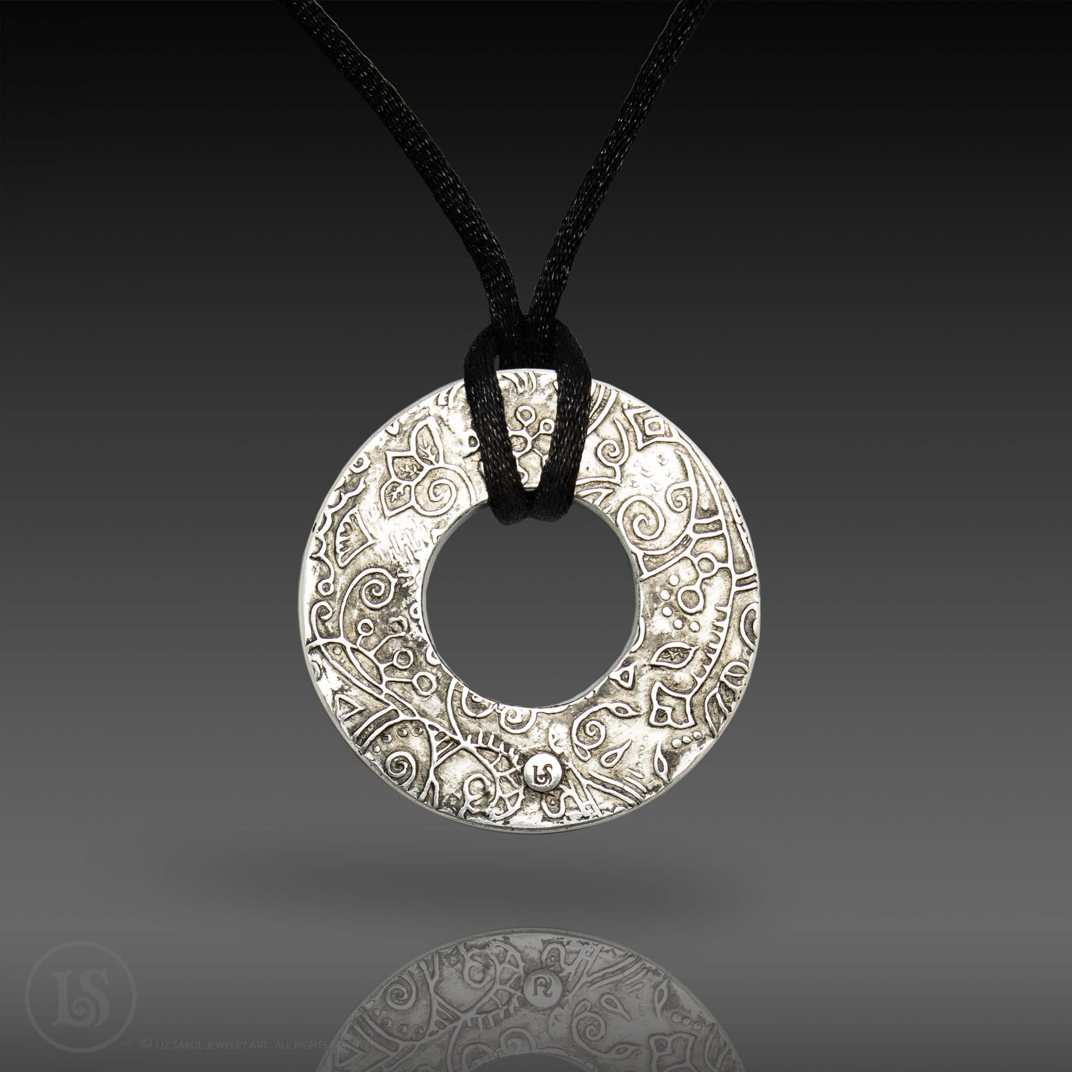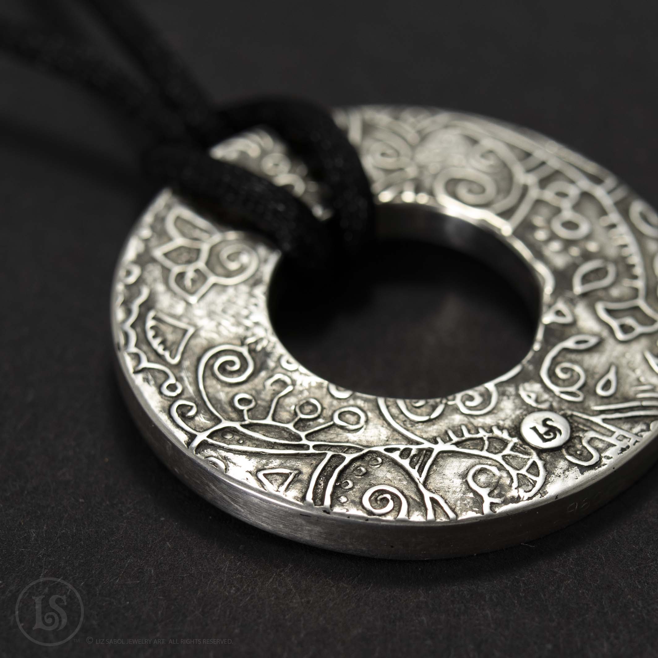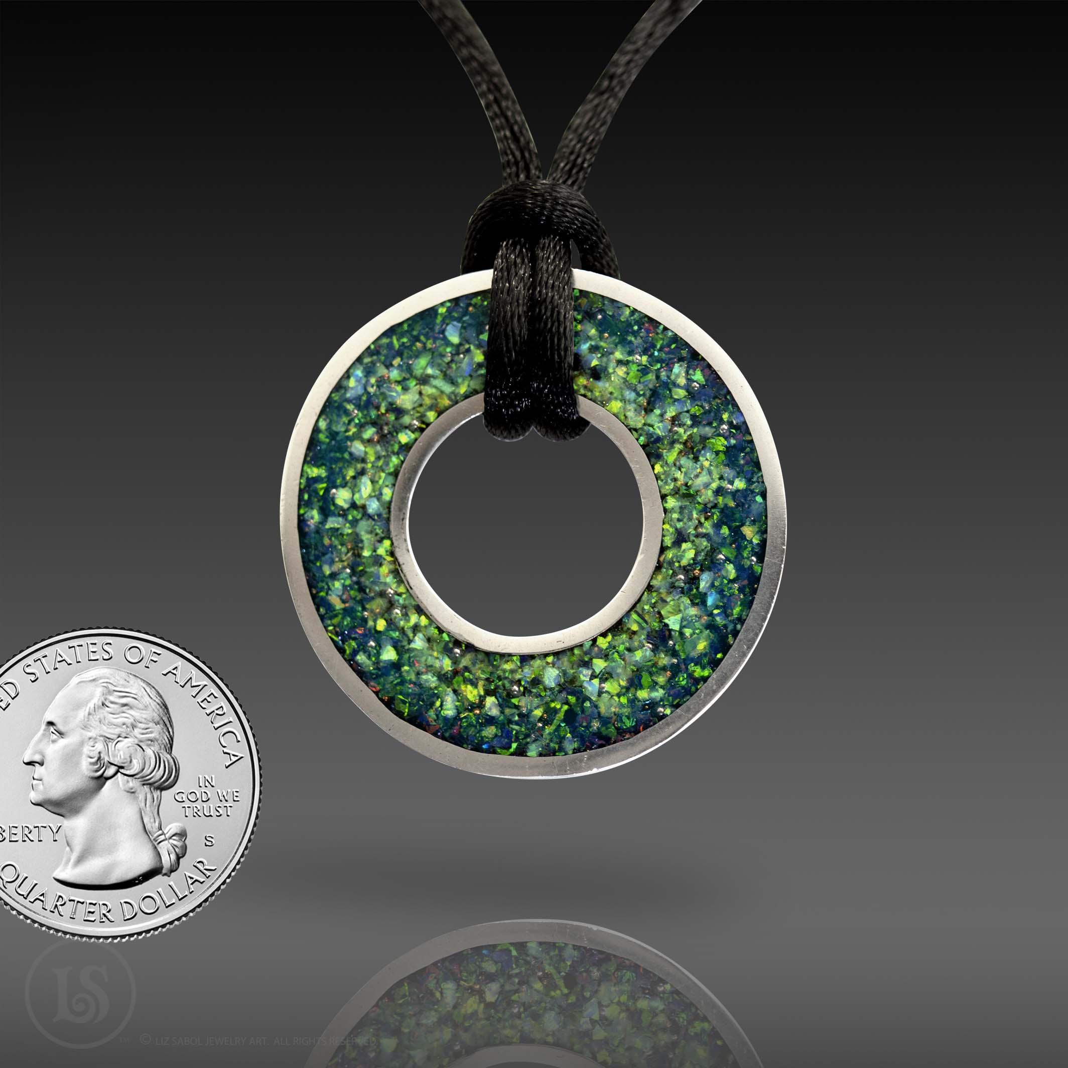 Hand-painted 960 sterling silver.  Hand-made, one-of-a-kind.  Lab Opal inlay.  Comes on an adjustable nylon cord - choker to 30".