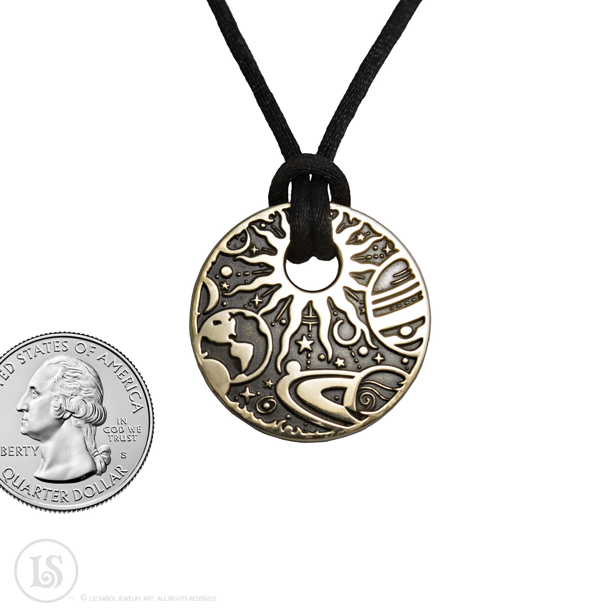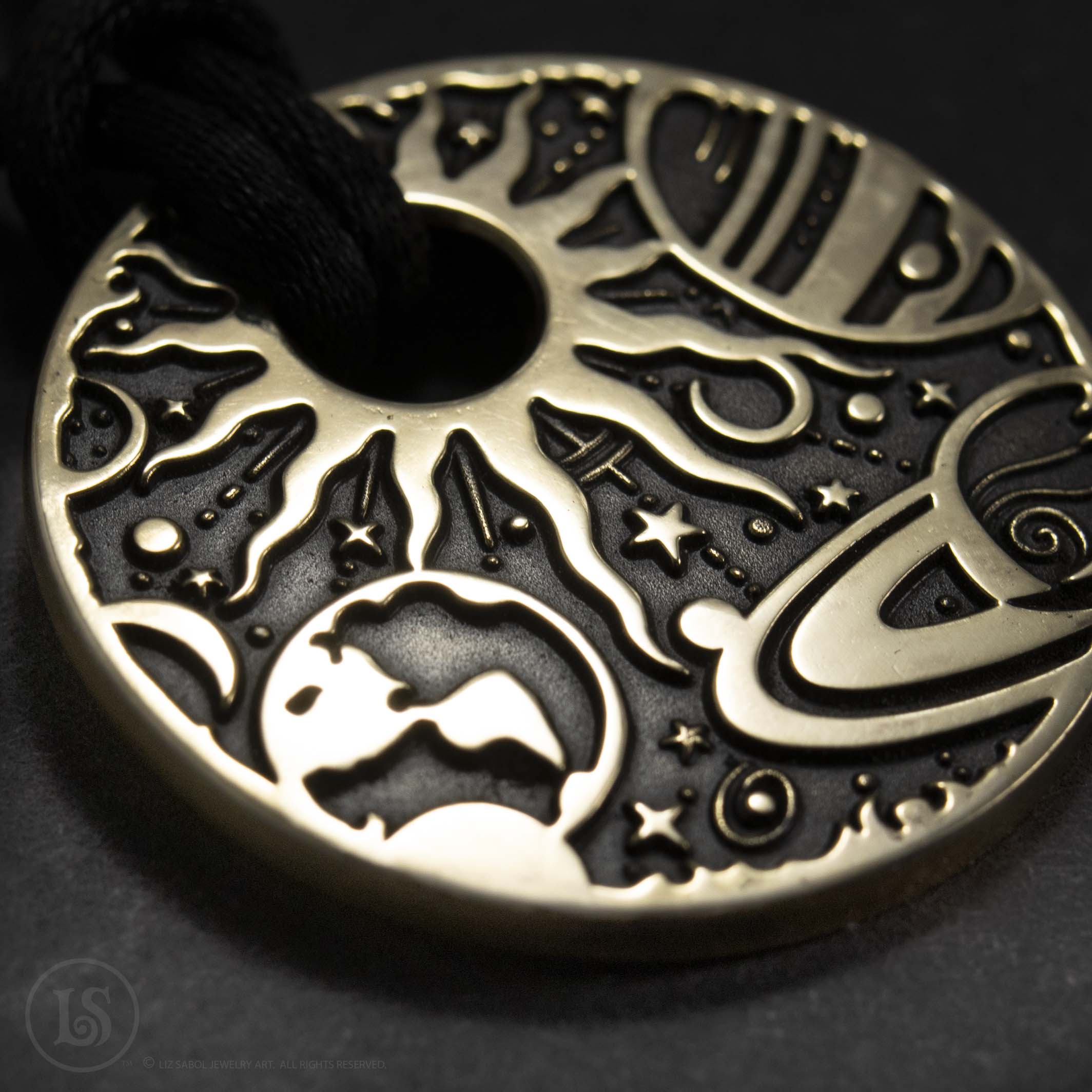 Pendant Brass Leather Cord, Patina. Solid brass pendant with my Solar System design in deep relief.