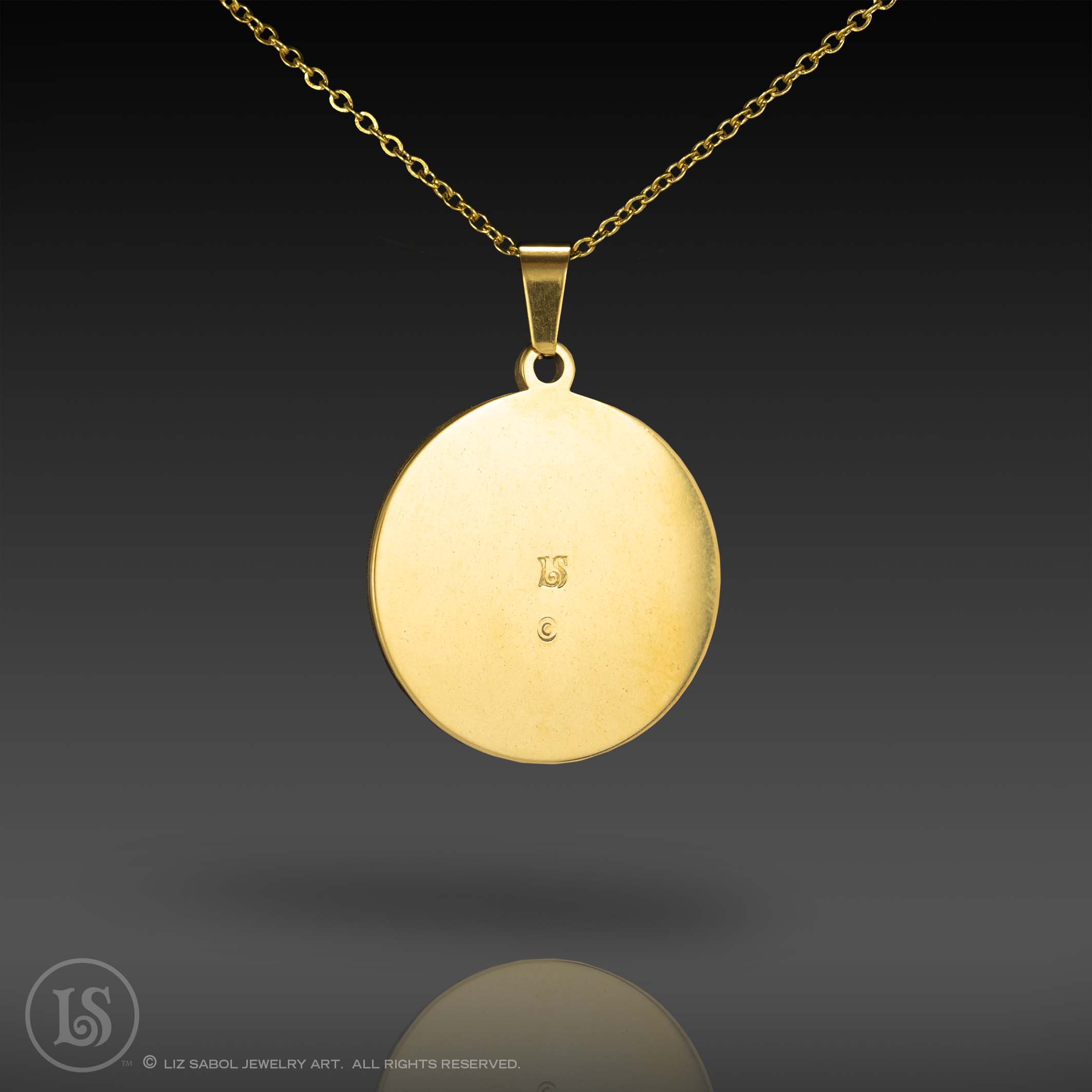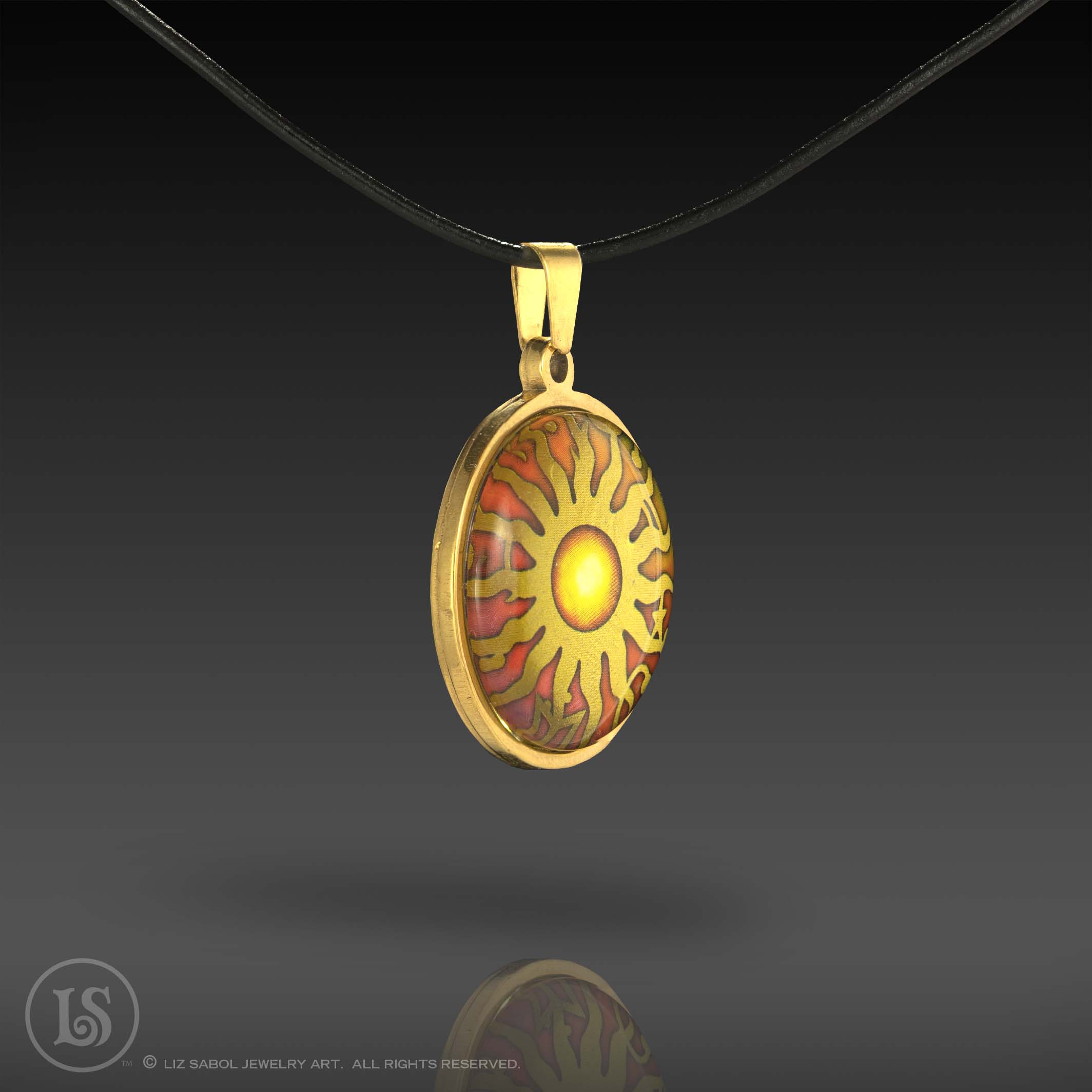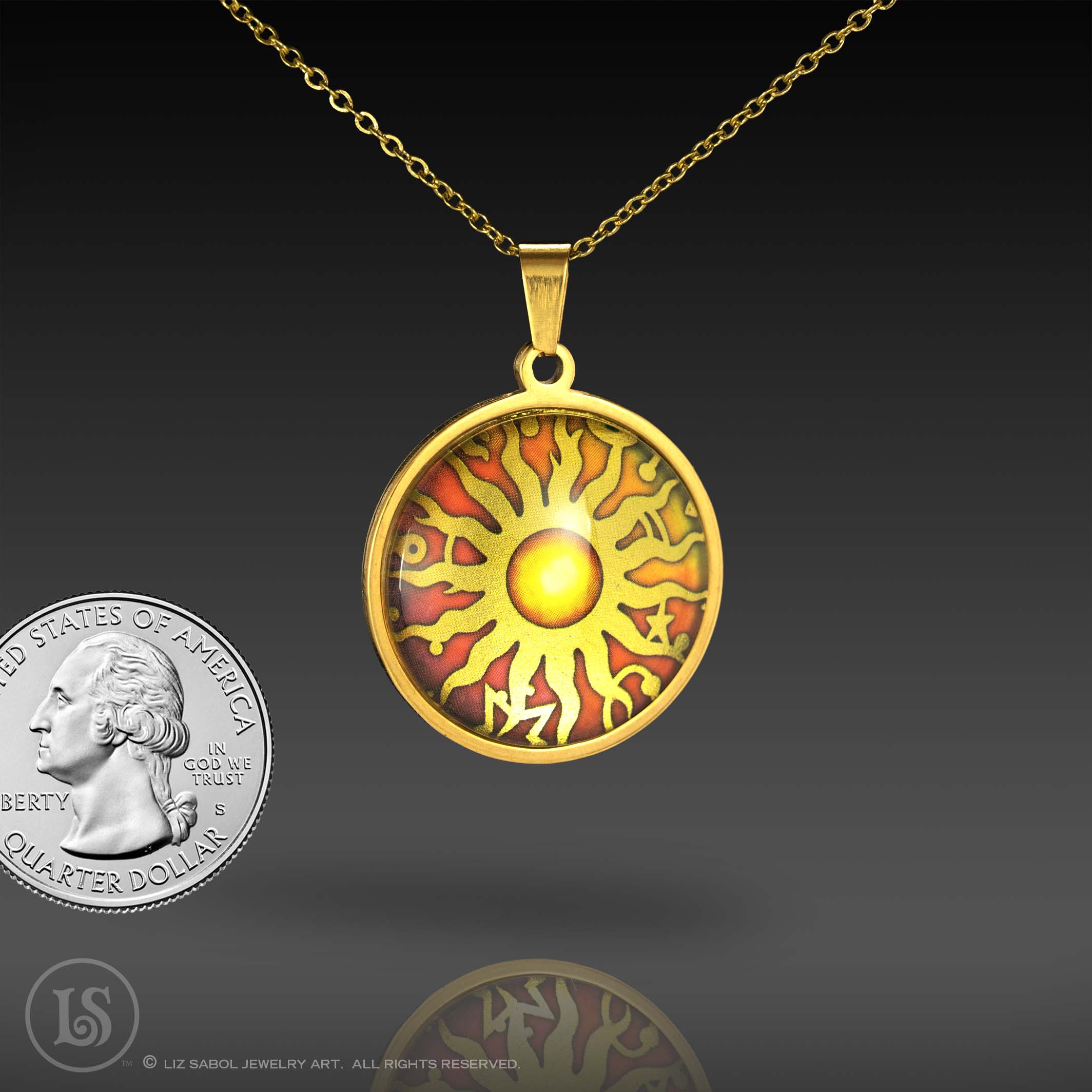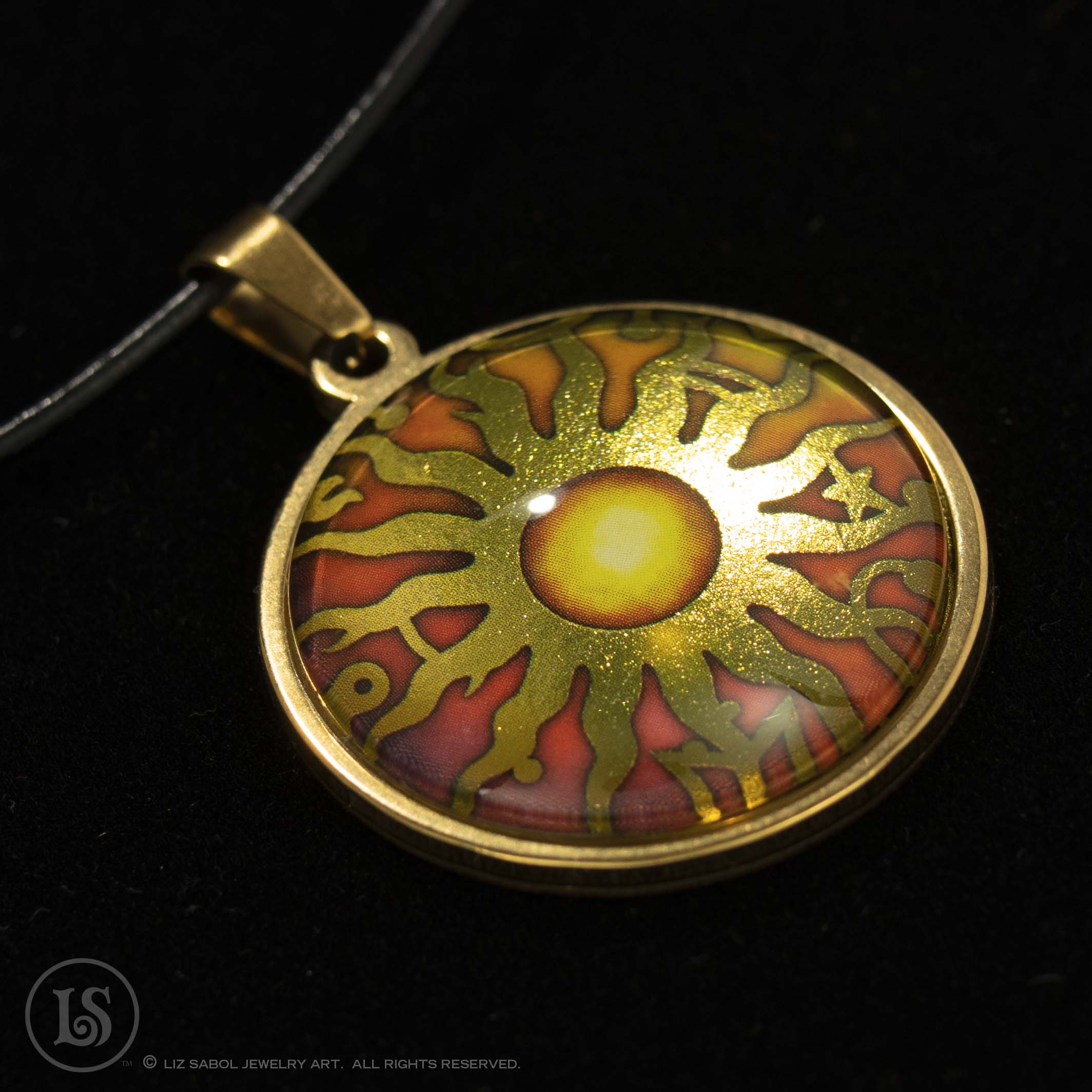 This is a high-quality reproduction in ink and foil of my popular handmade champleve Celestial Sun design, mounted on stainless steel and covered in solid glass. Affordable for everyone. Gold-plated. Comes with a stainless steel chain.