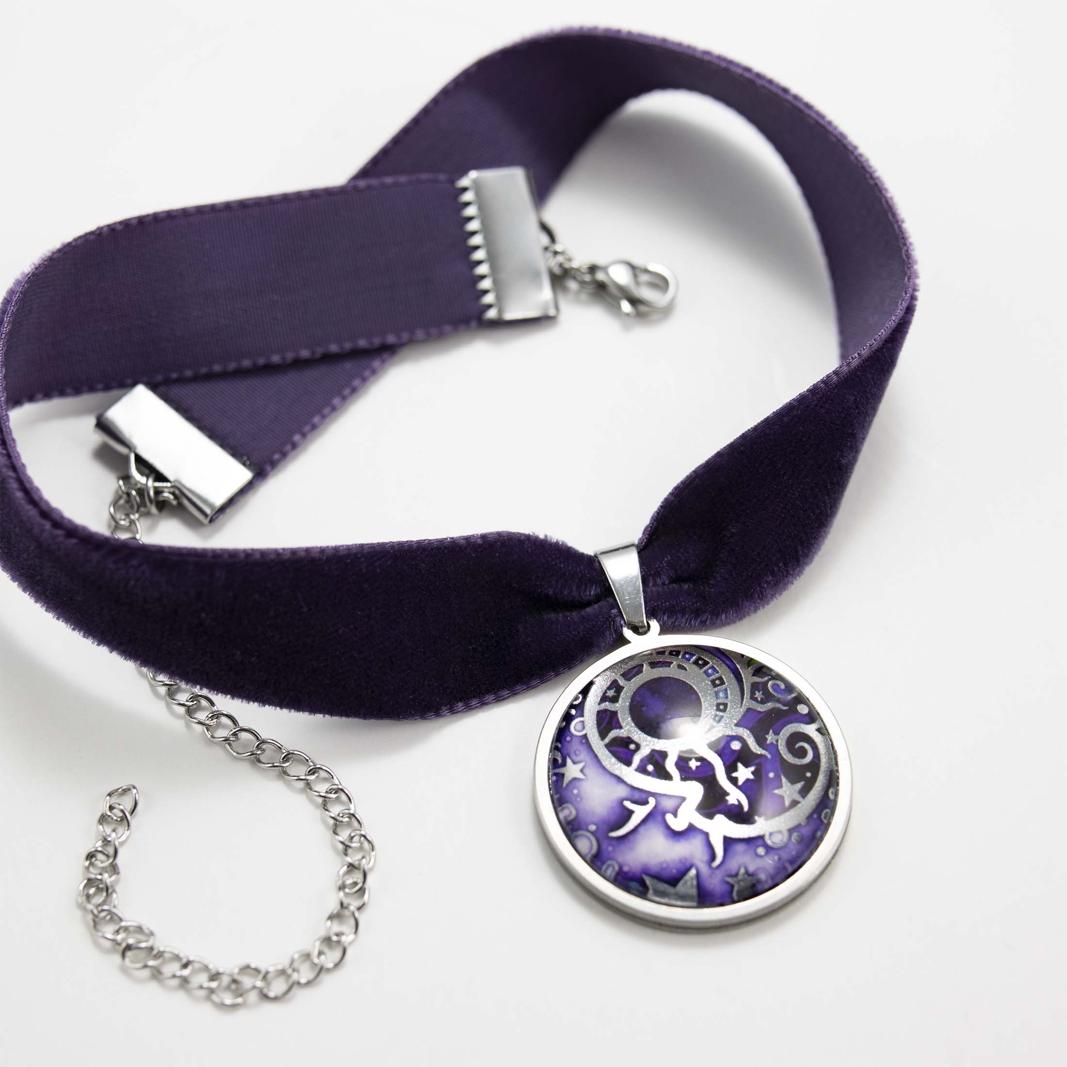 Man in the Moon Purple, Large Choker, Silver-tone, Glass, stainless Steel, velvet