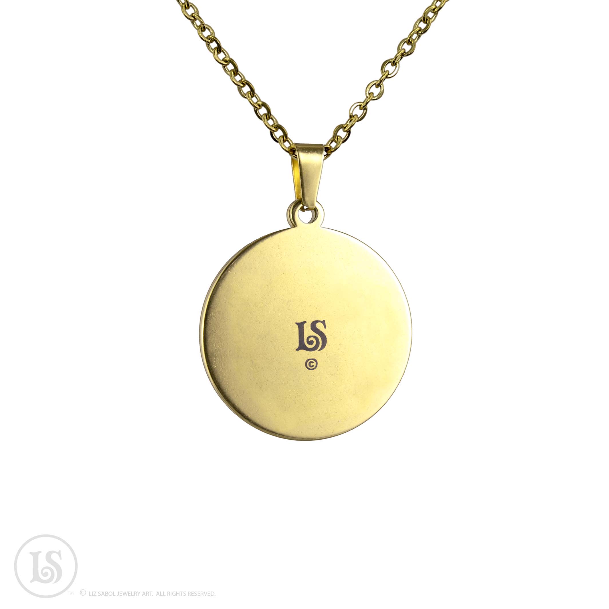 Ink and metallic foil accents on paper, mounted on stainless steel and covered in solid glass.