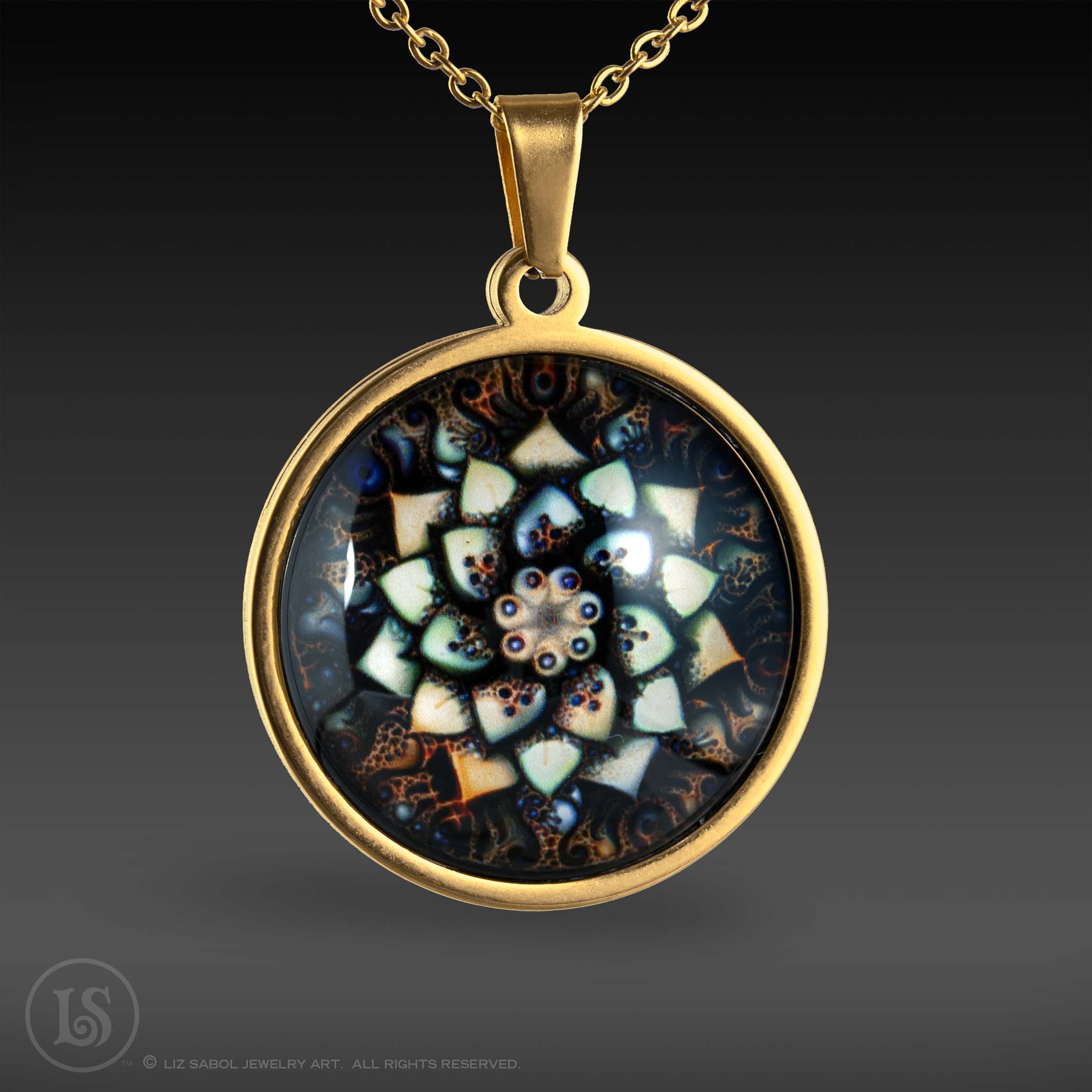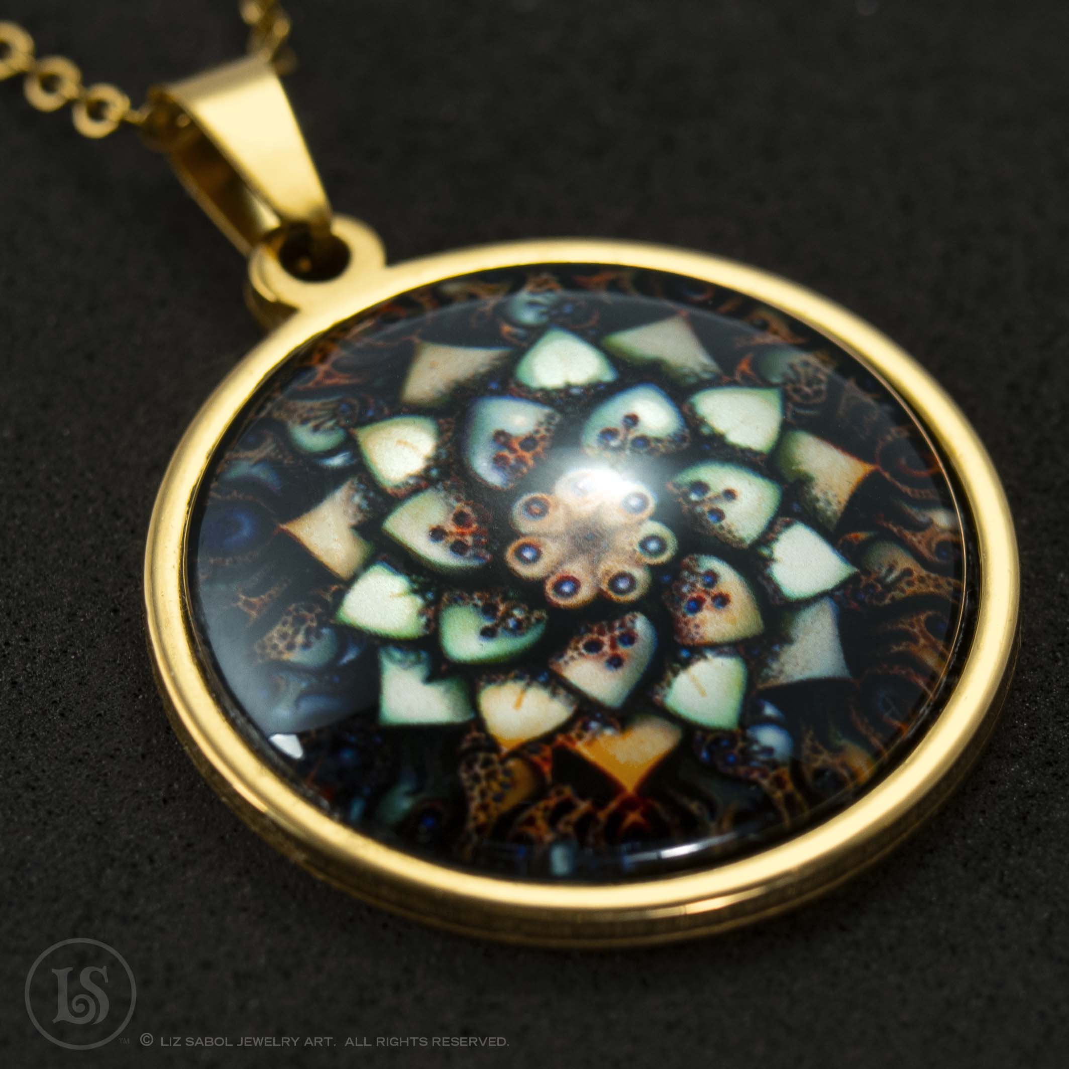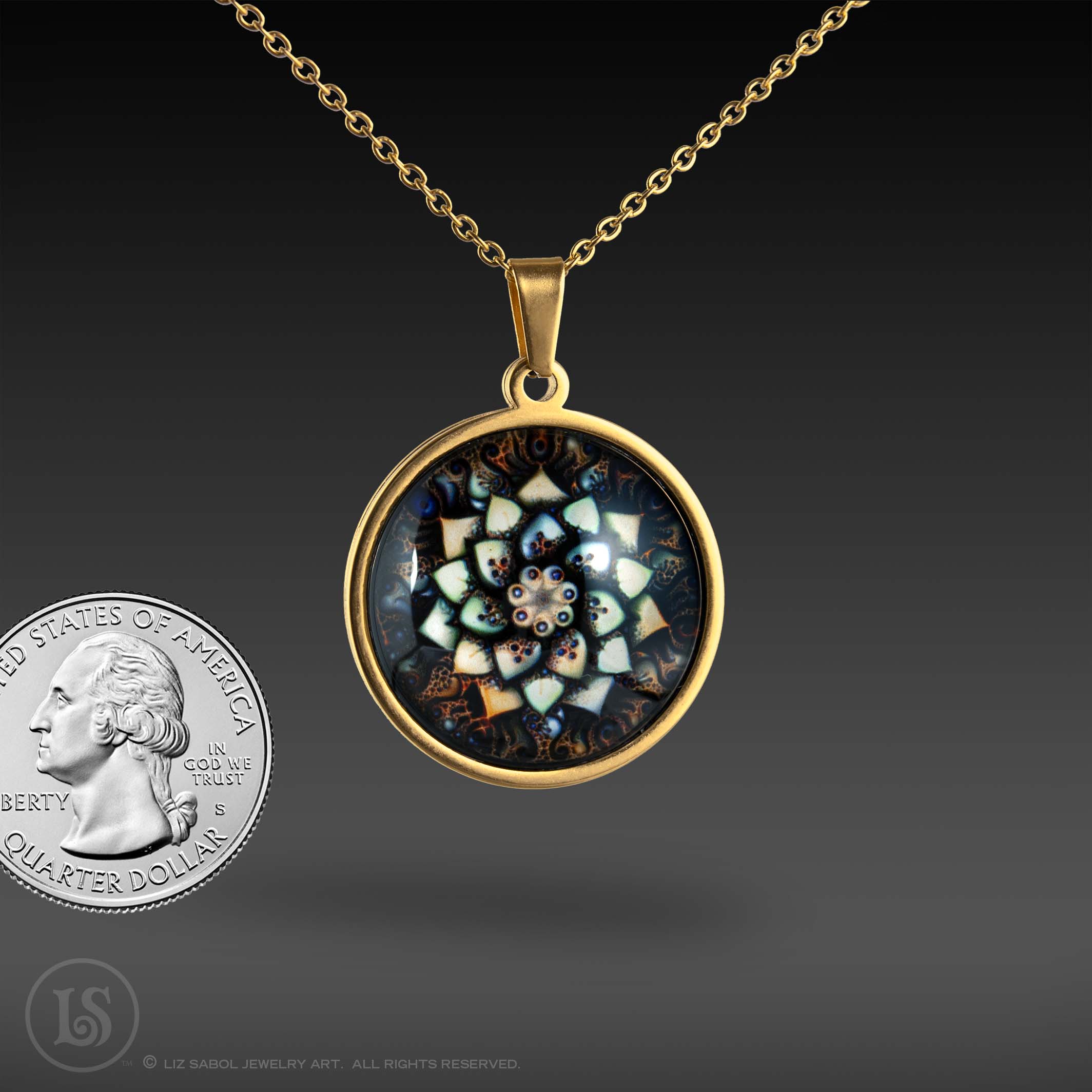 This is a high-quality reproduction in Giclee, archival fine-art print, with a mother-of-pearl shimmer, of my illustration #21 in the Mandala series, enhanced with artificial intelligence/machine learning techniques, mounted on stainless steel and covered in solid glass. Affordable for everyone. Available in gold-plated. Comes with a stainless steel chain.