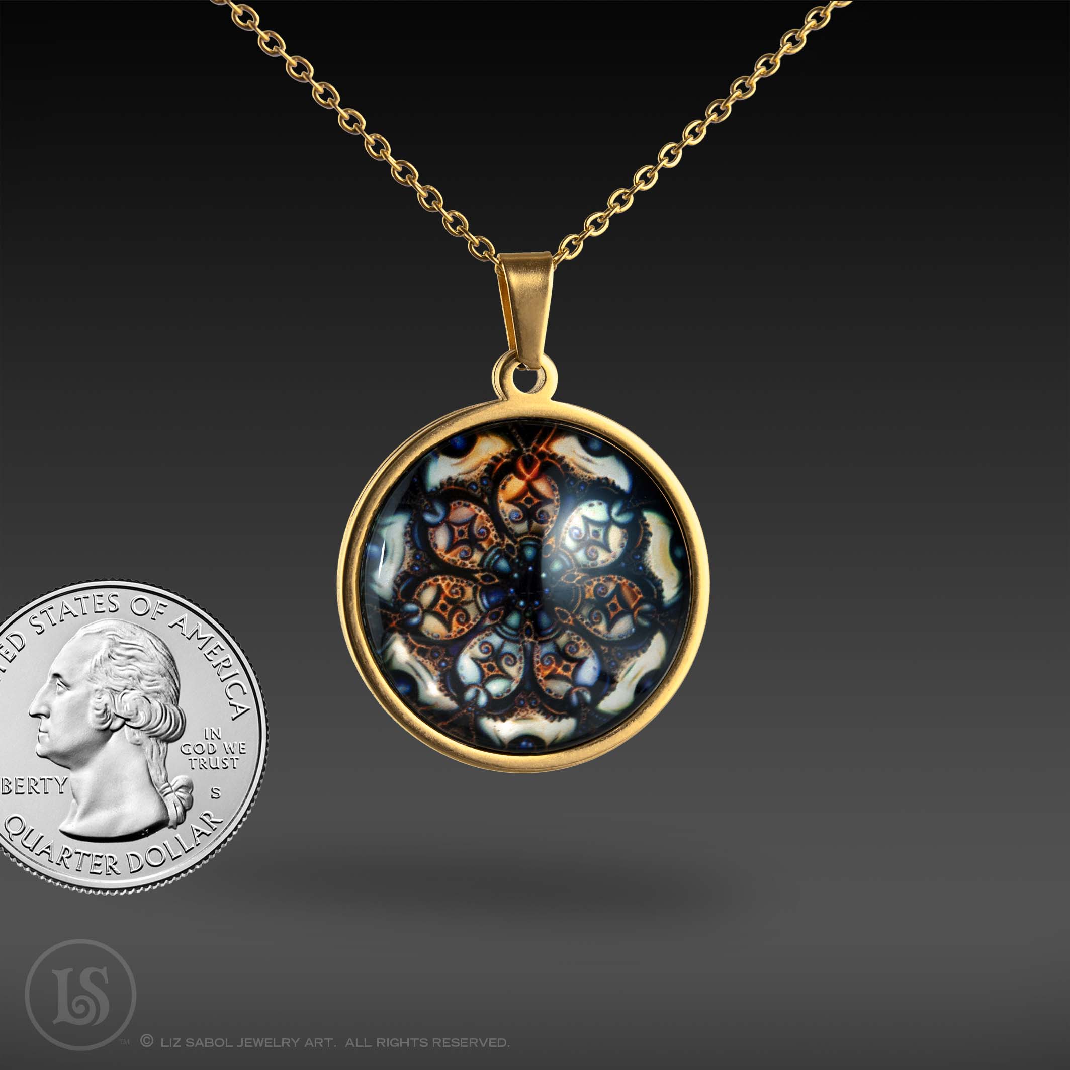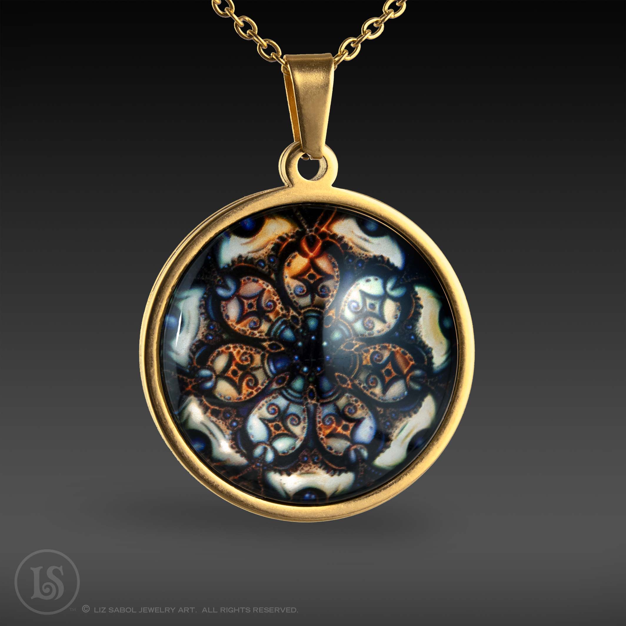 This is a high-quality reproduction in Giclee, archival fine-art print, with a mother-of-pearl shimmer, of my illustration #22 in the Mandala series, enhanced with artificial intelligence/machine learning techniques, mounted on stainless steel and covered in solid glass. Affordable for everyone. Available in gold-plated. Comes with a stainless steel chain.