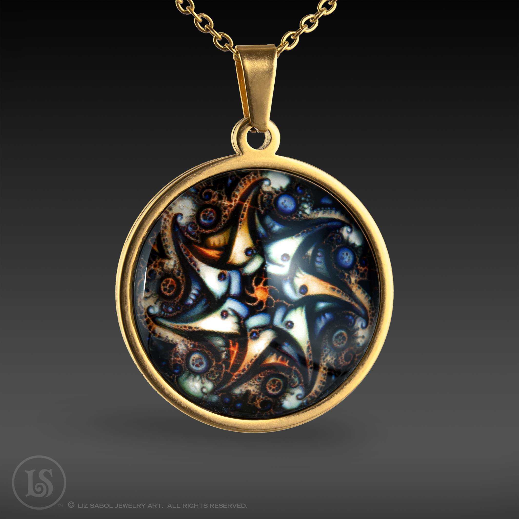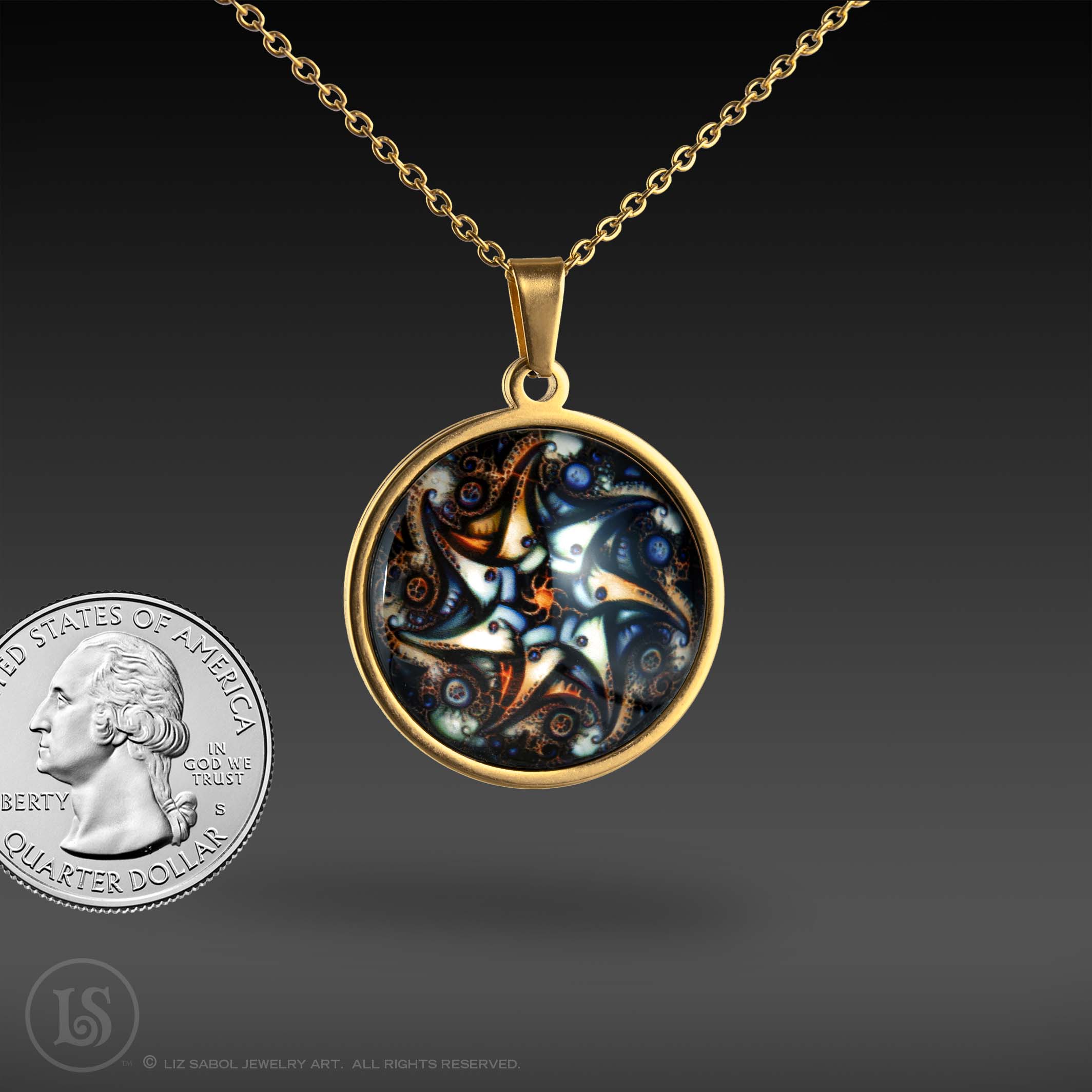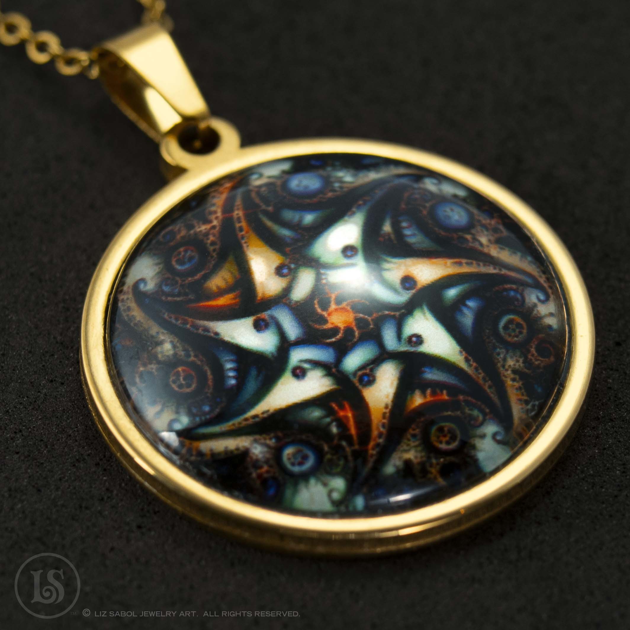 This is a high-quality reproduction in Giclee, archival fine-art print, with a mother-of-pearl shimmer, of my illustration #24 in the Mandala series, enhanced with artificial intelligence/machine learning techniques, mounted on stainless steel and covered in solid glass. Affordable for everyone. Available in gold-plated. Comes with a stainless steel chain.