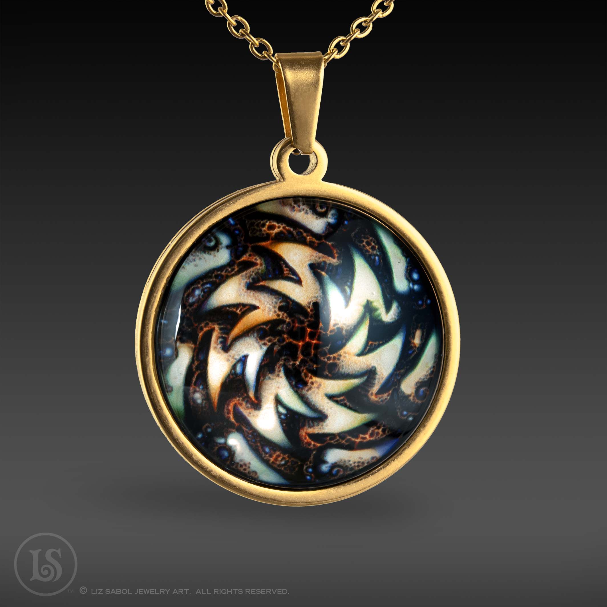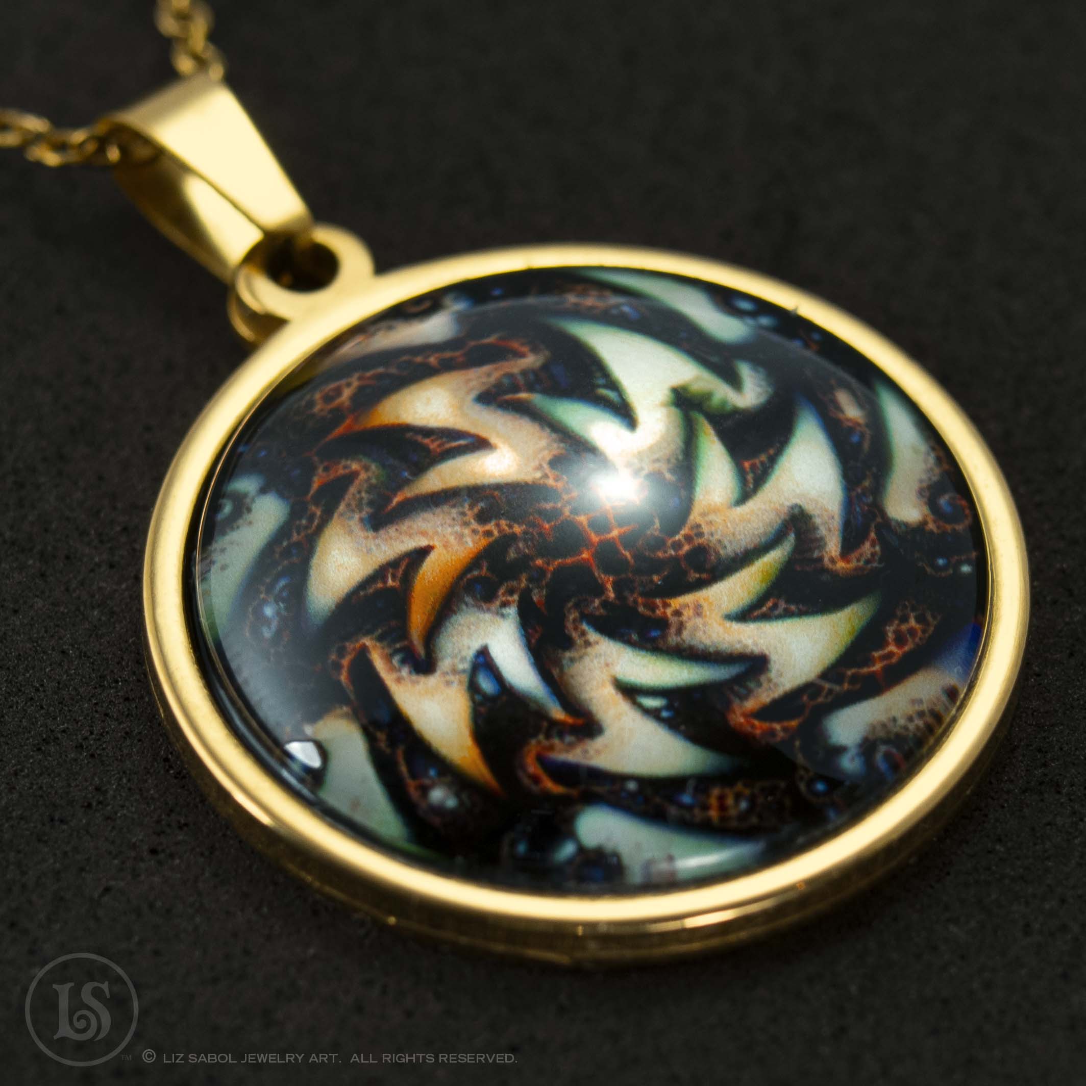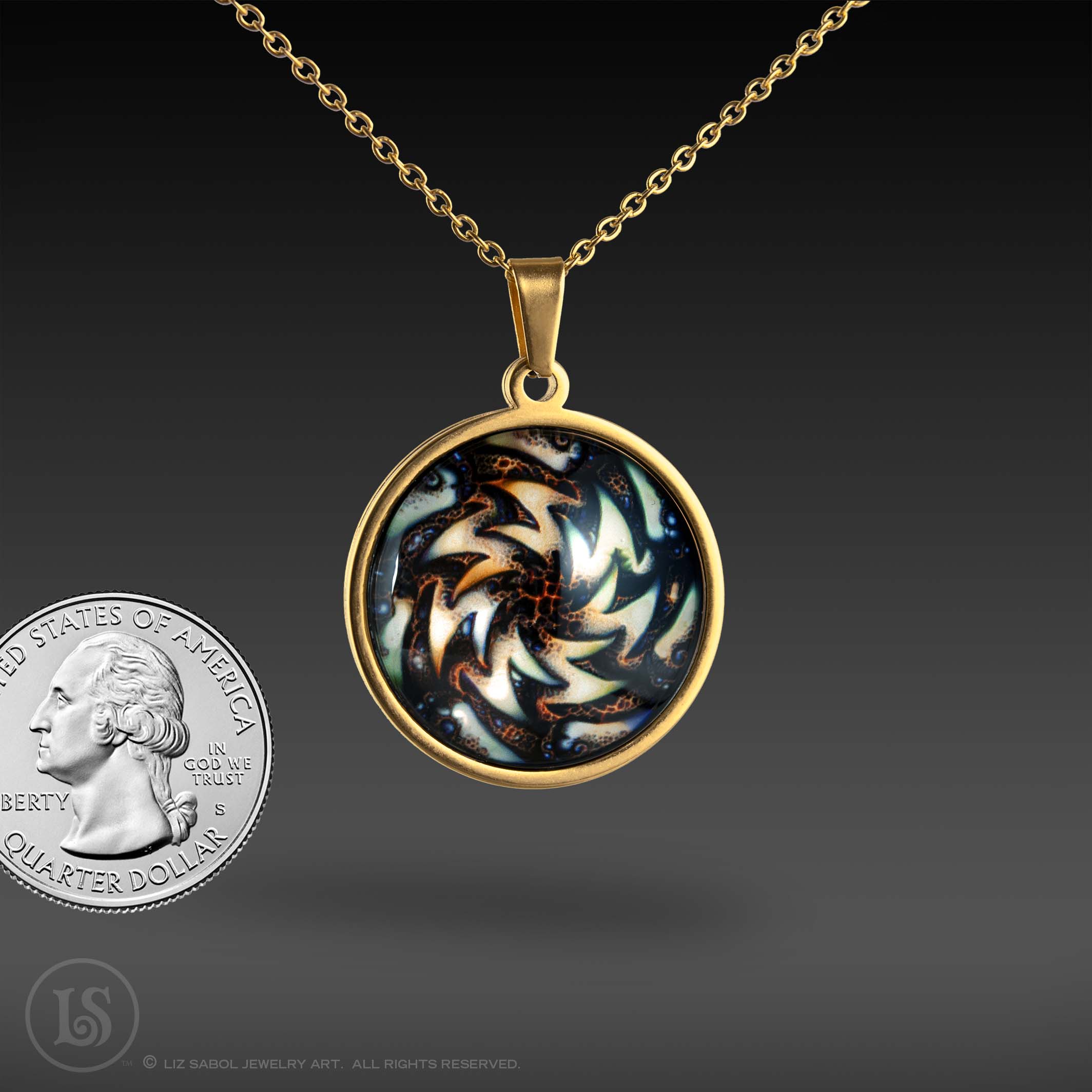 This is a high-quality reproduction in Giclee, archival fine-art print, with a mother-of-pearl shimmer, of my illustration #43 in the Mandala series, enhanced with artificial intelligence/machine learning techniques, mounted on stainless steel and covered in solid glass. Affordable for everyone. Available in gold-plated. Comes with a stainless steel chain.