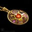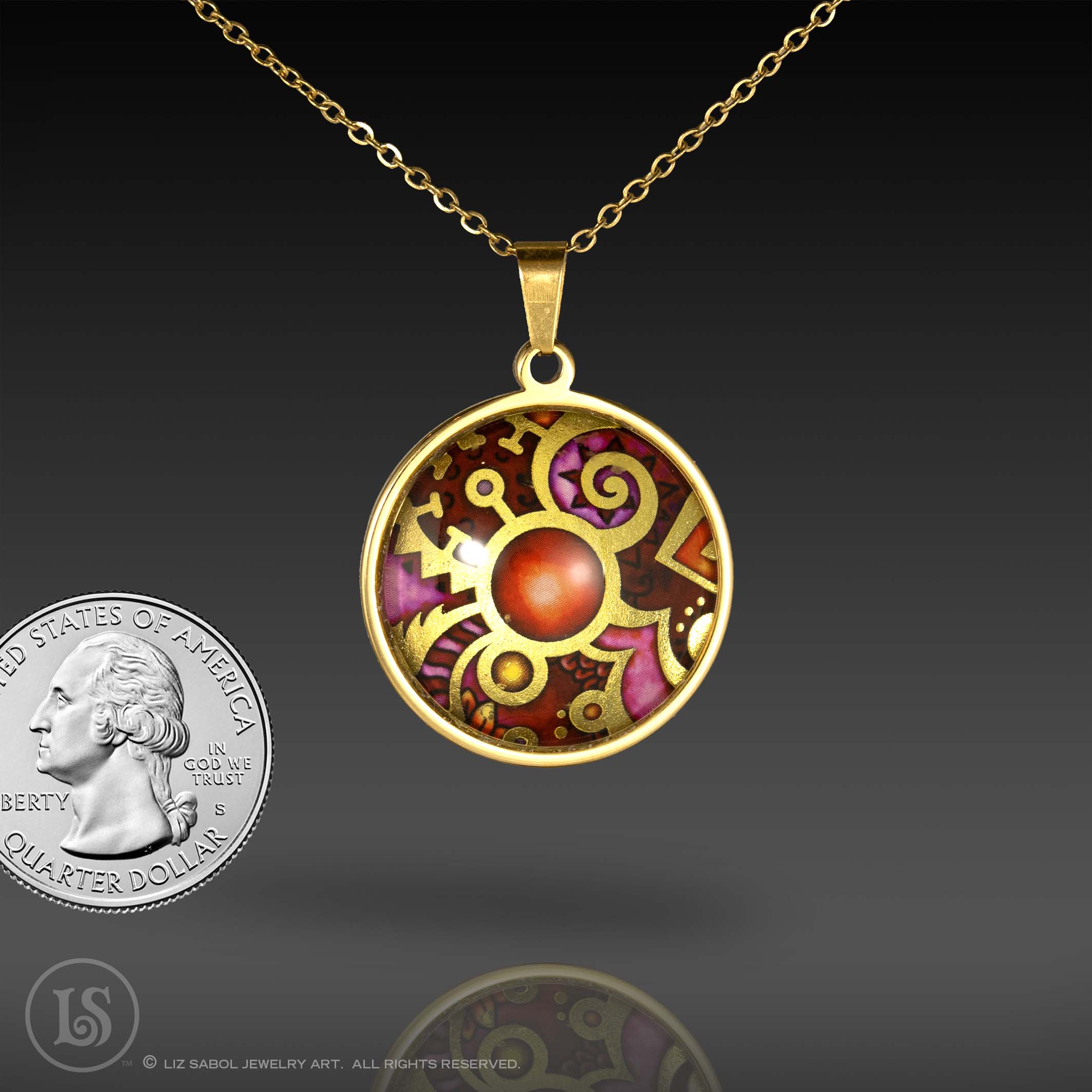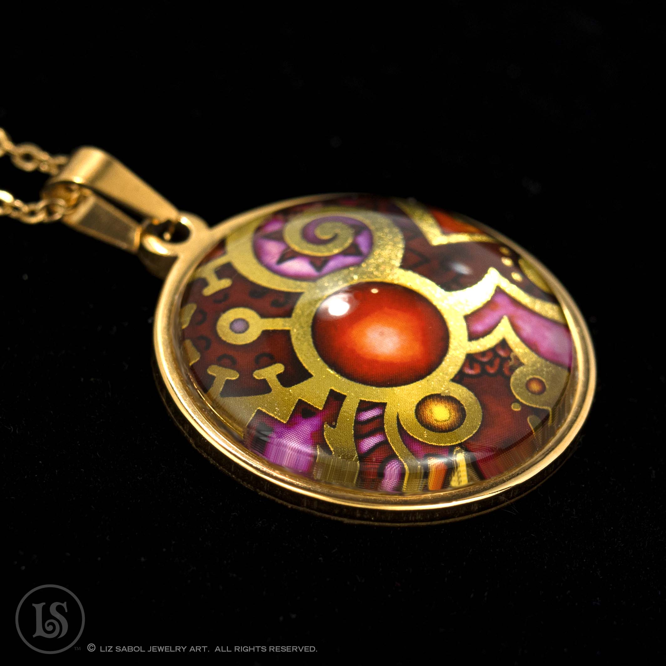 This is a high-quality reproduction in ink and foil of my popular handmade champleve Paisley design, mounted on stainless steel and covered in solid glass. Gold-plated. Affordable for everyone. Comes with a stainless steel chain.