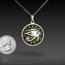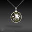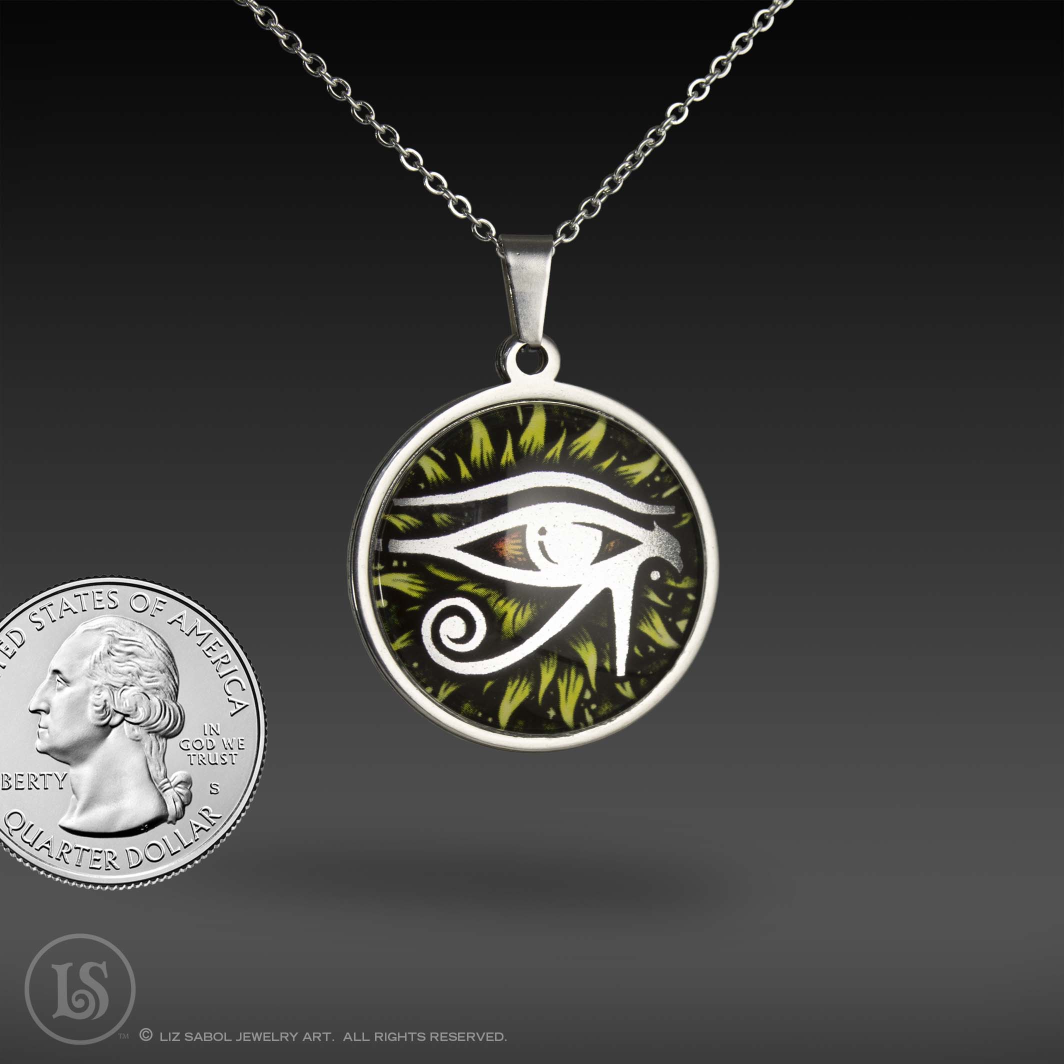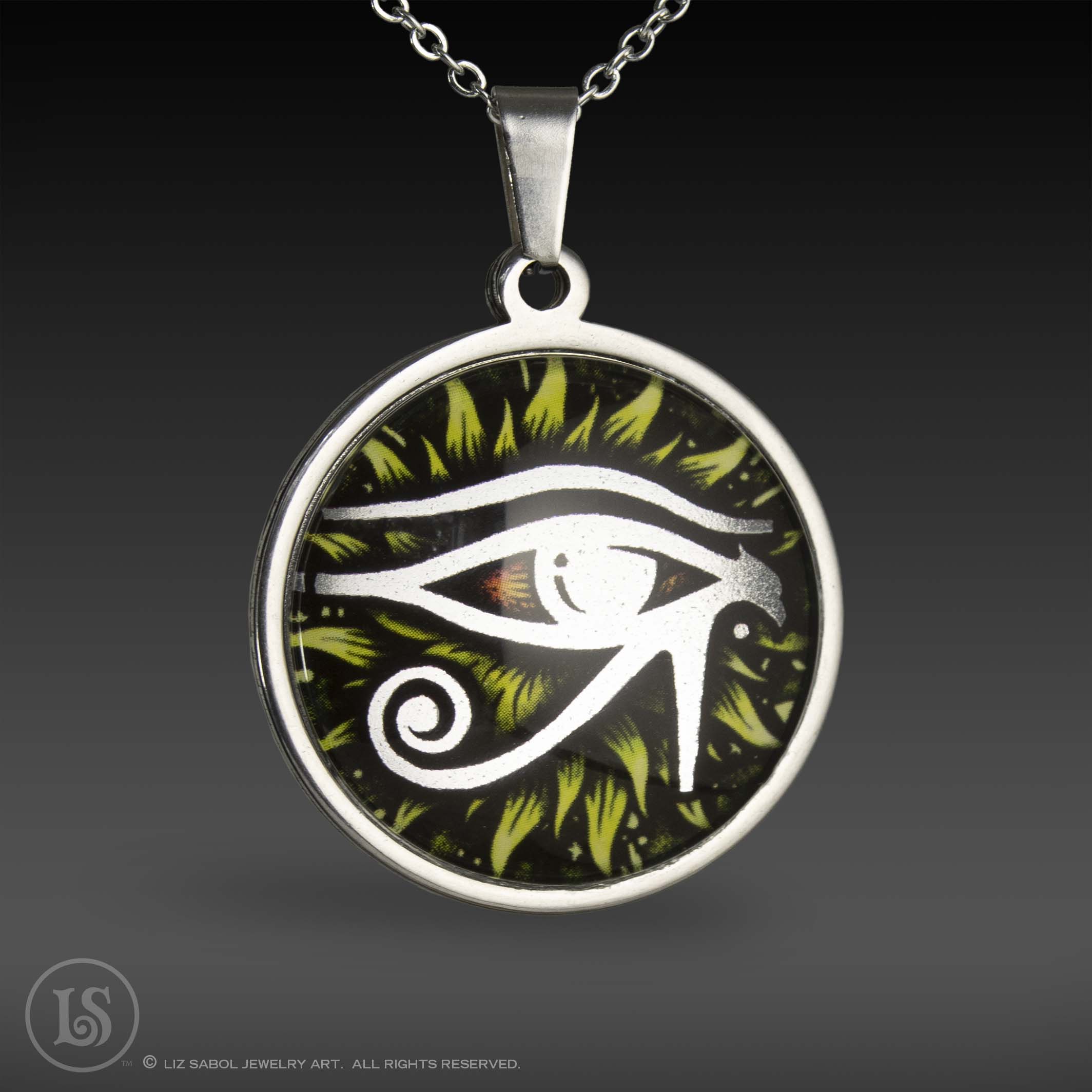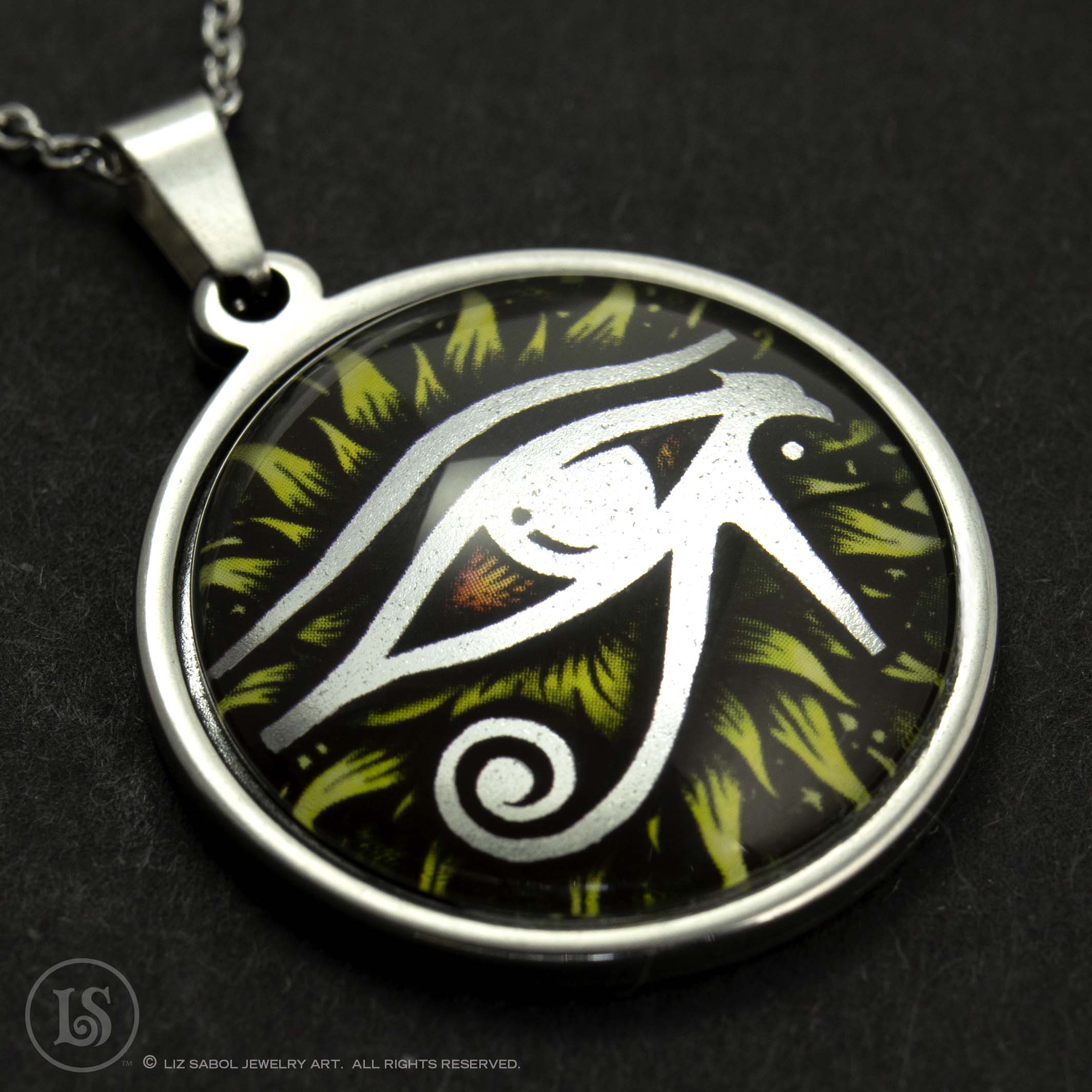 This is my wood-cut illustration of the Eye of Ra symbol. In ancient Egypt, the Eye of Ra repelled negative energy and restored harmony. Seen as a symbol of strength. The Eye of Ra is associated with the sun and the Eye of Horus with the Moon. Features metallic accents and mounted on stainless steel and covered in solid glass. Affordable for everyone. Comes with a stainless steel chain.